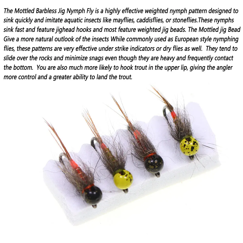 El Mottled Bead Jig Nymph Fly es un patrón de ninfa ponderado altamente efectivo diseñado para hundirse rápidamente e imitar insectos acuáticos como moscas, caddisflies o moscas de piedra.Estas ninfas se hunden rápidamente y cuentan con ganchos de cabeza blanda y la mayoría cuentan con cuentas de plantilla moteadas.La cuenta moleteada brinda una perspectiva más natural a los insectos. Si bien se usan como moscas de ninfas de estilo europeo, estos patrones también son muy efectivos bajo indicadores de golpe o moscas secas.Tienen a deslizarse sobre las rocas y minimizar los enganches aunque son pesados y entren en contacto frecuente con el fondo.También es mucho más probable que enganche la trucha en el labio superior, dando al pescador más control y una mayor capacidad para pescar la trucha.
