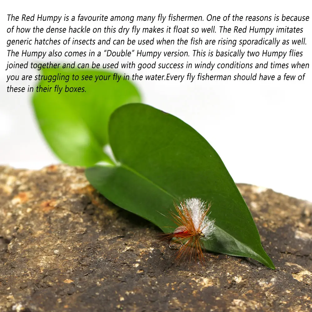El Red Humpy es el favorito entre muchos pescadores de mosca.Una de las razones es por la forma que el denso hackle de esta mosca seca la hace flotar tan bien.El Red Humpy imita las escotillas genéricas de los insectos y también se puede utilizar cuando los peces suben esporádicamente. El Humpy también viene en una versión "Double" Humpy.Se trata básicamente de dos moscas molestas unidas y se pueden utilizar con buen éxito en condiciones de viento y momentos en momentos en que está luchando por ver su mosca en el agua.Todo pescador de moscas debería tener algunos de ellos en sus cajas de moscas.