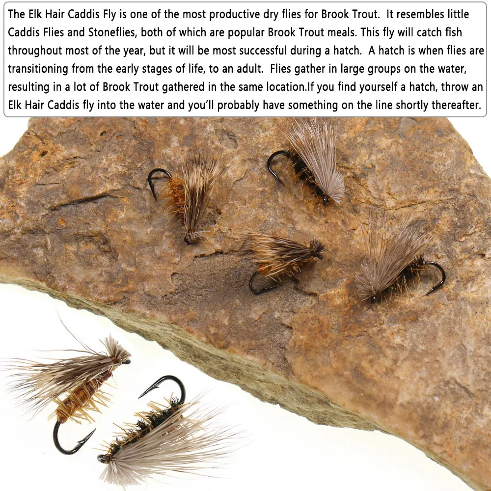 El Elk Hair Caddis Fly es una de las moscas secas más productivas para la trucha de Brook.Se asemeja a pequeñas moscas de Caddis y Stoneflies, ambas son comidas populares de trucha de Brook.Esta mosca atrapará peces durante la mayor parte del año, pero tendrá el mayor éxito durante una escotilla.Una escotilla es cuando las moscas están pasando de las primeras etapas de la vida a un adulto.Las moscas se reúnen en grandes grupos en el agua, lo que da como resultado una gran trucha de Brook se reúnen en el mismo lugar. Si te encuentras una escotilla, lanza un Elk Hair Caddis vuele al agua y probablemente tendrá algo en la línea poco después..