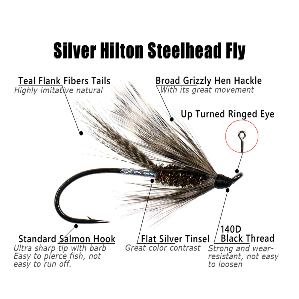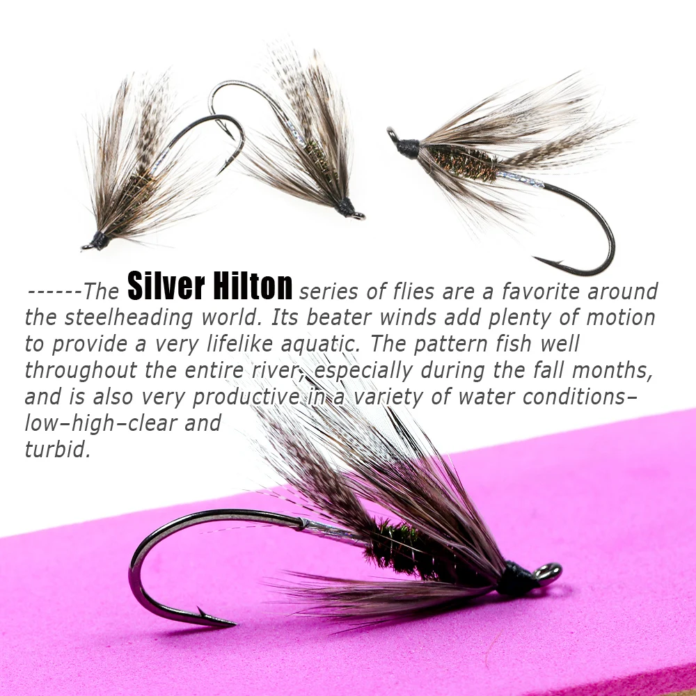 ------ La serie de moscas Silver Hilton es una de las favoritas en todo el mundo de los revestimientos del acero.Nuestras moscas de cabeza de acero están atadas sobre un gancho de salmón de níquel negro, ojo voltado hacia arriba.Sus vientos batidores añaden mucho movimiento para proporcionar un agua muy realista.El patrón se pesca bien por todo el río, especialmente durante los meses de otoño, y también es muy productivo en una variedad de condiciones de agua (baja, alta, clara y turva.Este incluso presenta un trasero plateado, que es un color probado que funciona para Steelhead.