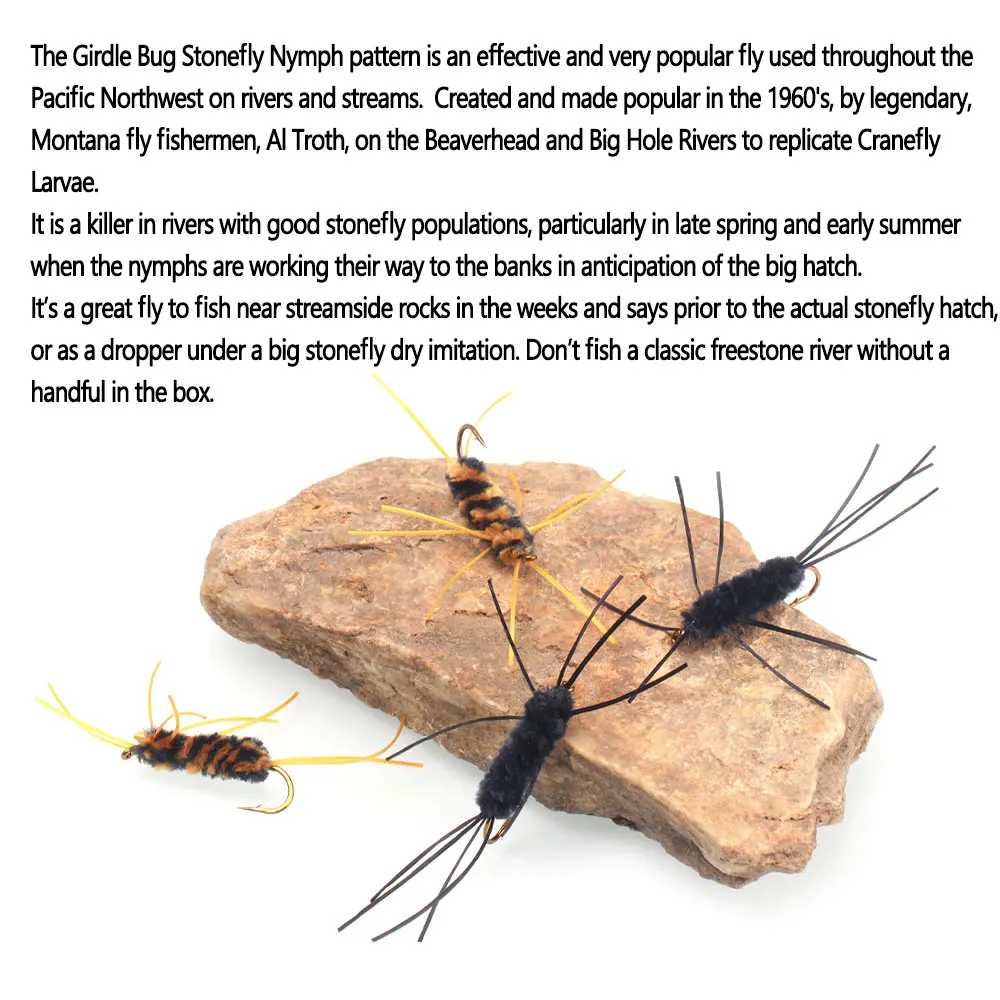El patrón Girdle Bug Stonefly Nymph es una mosca eficaz y muy popular que se utiliza en todo el noroeste del Pacífico en ríos y arroyos.Creado y volvió popular en la década de 1960, por los legendarios pescadores de mosca Montana, Al Troth, en la cabeza de castor y los ríos Big Hole para replicar las larvas cranefly.