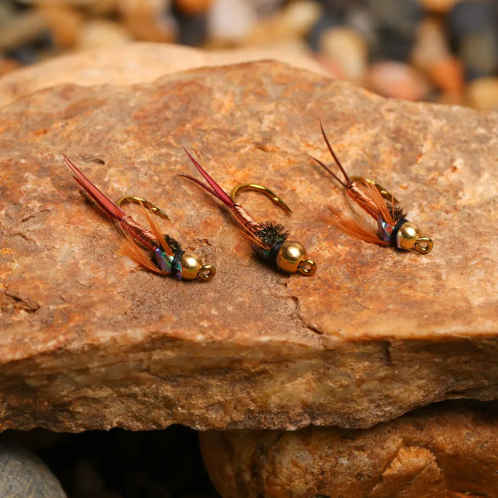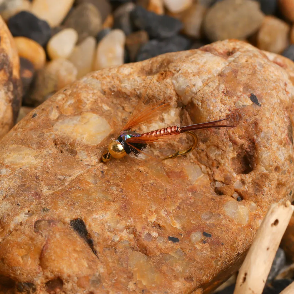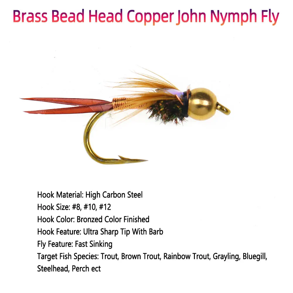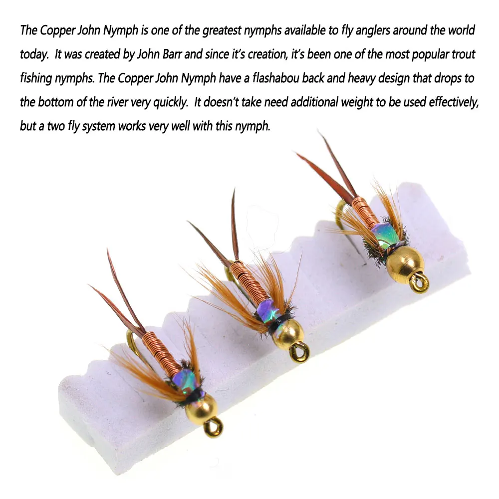 La Ninfe de Copper John es una de las ninfas más grandes disponibles para hacer volar a los pescadores de todo el mundo hoy.Ha sido creado por John Barr y desde su creación, ha sido una de las ninfas de pesca de trucha más populares.El Copper John Nymph tiene un respaldo de flashabe y un diseño pesado que cae al fondo del río muy rápidamente.No se necesita peso adicional para usarse de manera efectiva, pero un sistema de dos moscas funciona muy bien con esta ninfa.