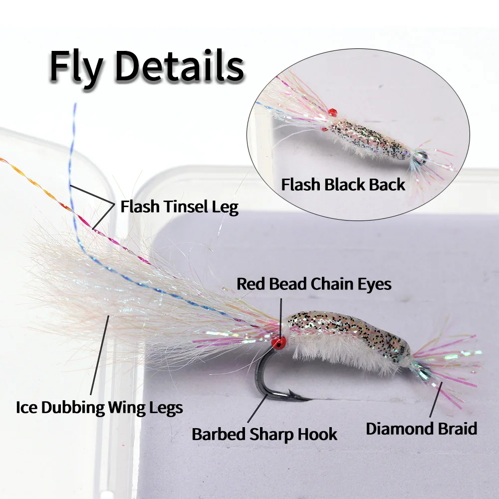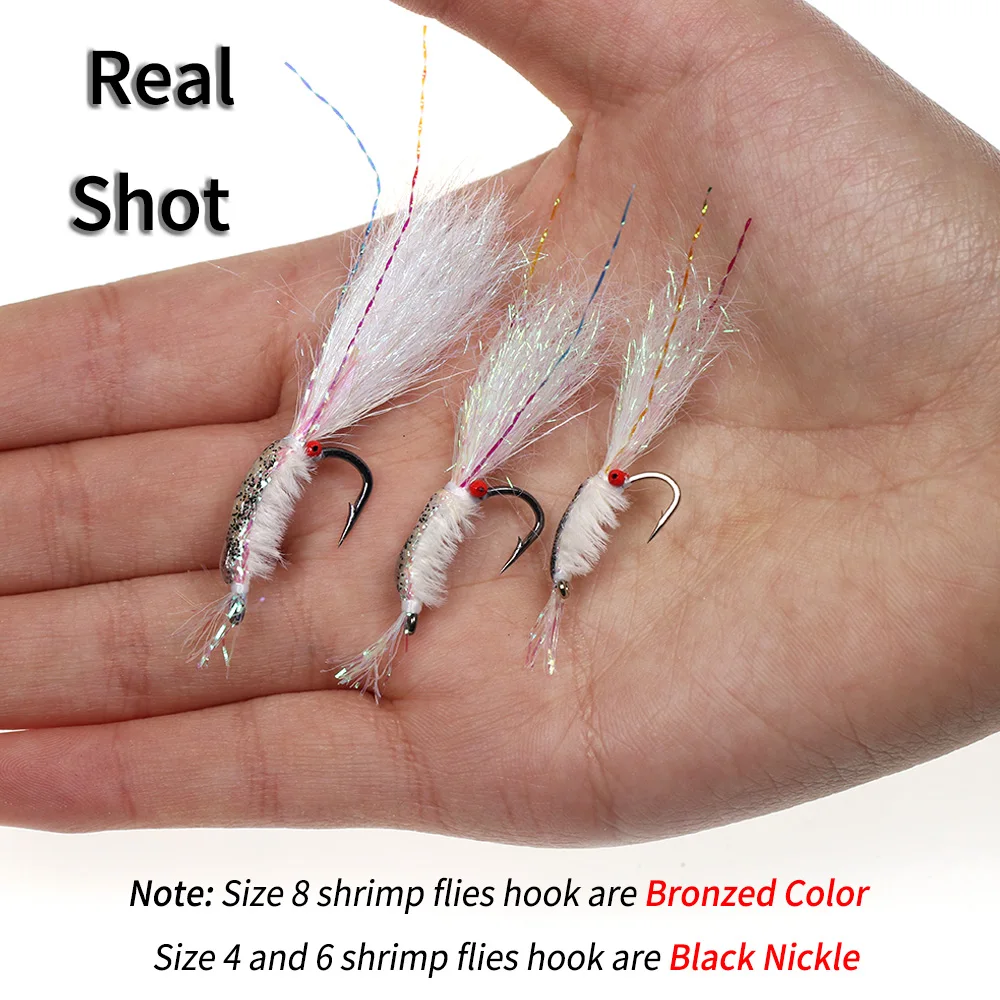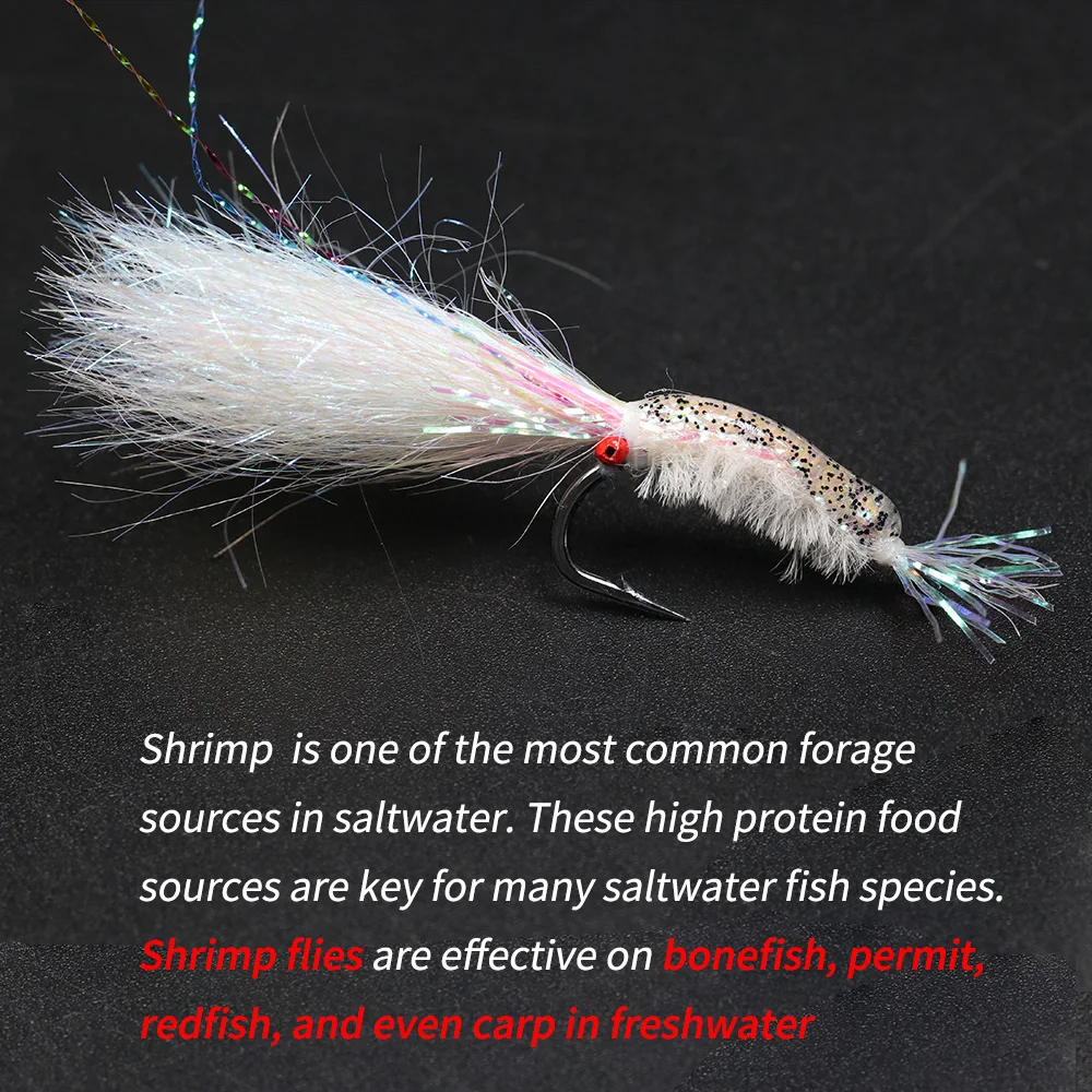 Las moscas de los camarones imitan una de las fuentes de forraje más habituales en agua salada.Estas fuentes alimenticias con alto contenido de proteínas son clave para muchas especies de peces de agua salada.Las moscas de los camarones son eficaces para los peces hueso, los permisos, los peces enrojeces e incluso las carpas en agua dulce.Si pescas las zapatillas, entonces es imprescindible una buena selección de moscas de los camarones.