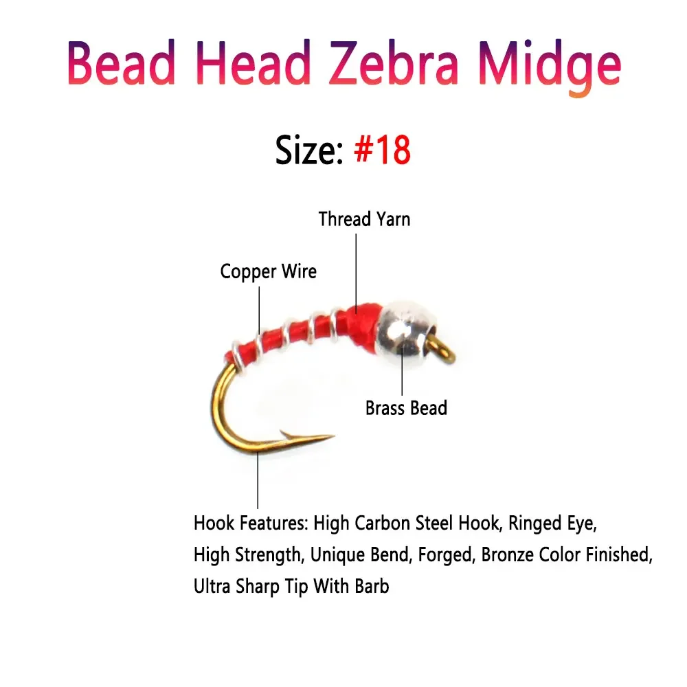 Bead Head Zebra Midge es un patrón de mosca que se utiliza para imitar tanto las etapas pupital como la ninfa de una amplia variedad de insectos recién nacidos acuáticos.El Zebra Midge presenta un cuerpo cónico, abdomen acanalado y una cabeza de cuentas, lo que lo convierte en un patrón de mosca versátil y eficaz para todos los tamaños y tipos de truchas.