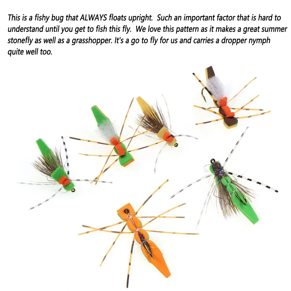 Este es un pez que SIEMPRE flota en posición vertical.Un factor tan importante que es difícil de entender hasta que llegas a pescar esta mosca.Nos encanta este patrón porque es una excelente mosca de piedra de verano y un saltamontes.Es una opción para volar para nosotros y también lleva muy bien una ninfa contagoteo.