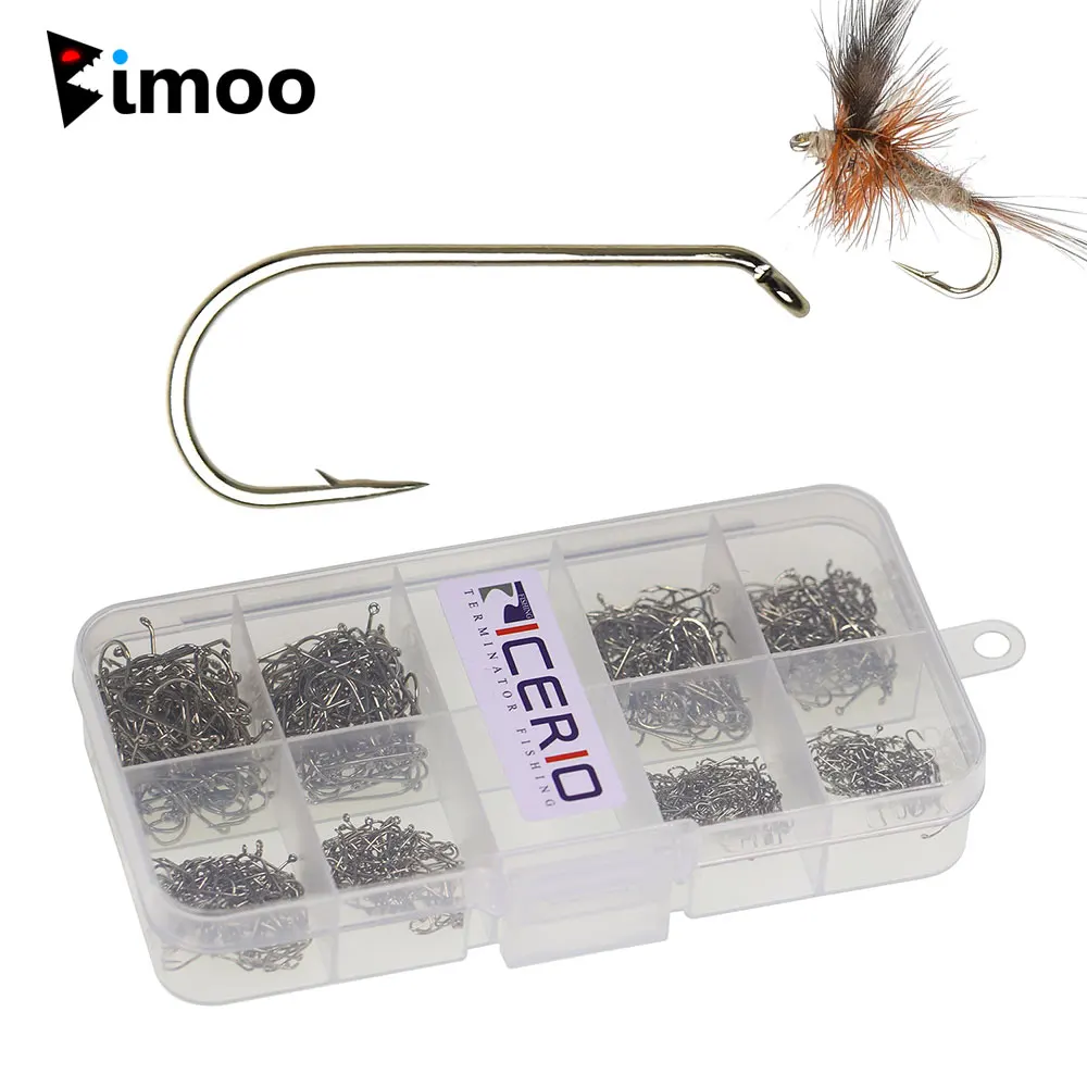 Bimoo 800 unids/caja tamaño surtido de acero de alto carbono anzuelo para atar moscas secas para moscas secas Adams Caddis ninfas Señuelos de Pesca de trucha
