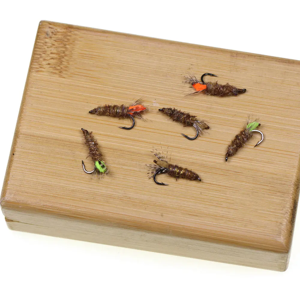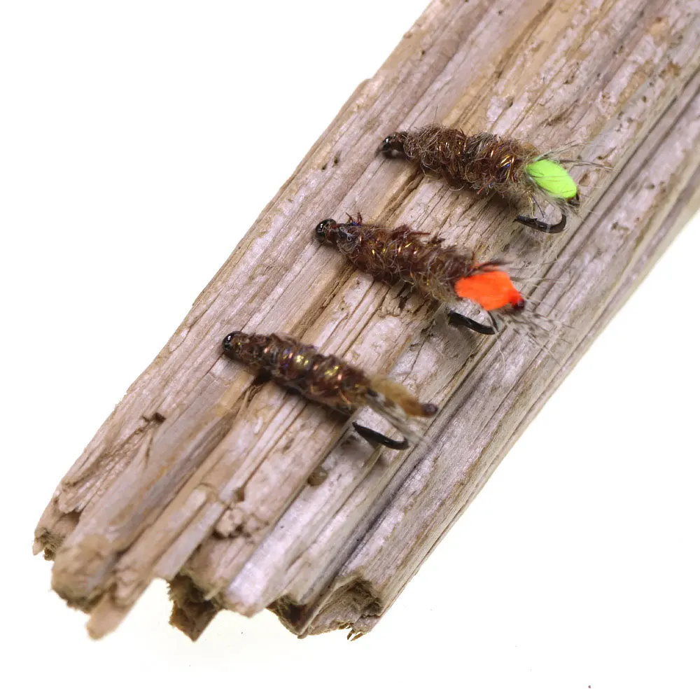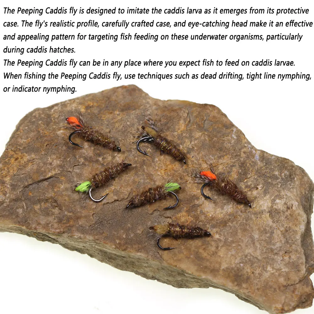 La mosca Peeping Caddis está diseñada para imitar la larva caddis a medida que surge de su funda protectora.El perfil realista de la mosca, el estuche cuidadosamente elaborado y la cabeza llamativa la convierten en un patrón eficaz y atractivo para apuntar a la alimentación de peces en estos organismos submarinos, especialmente durante las escotillas de caddis.