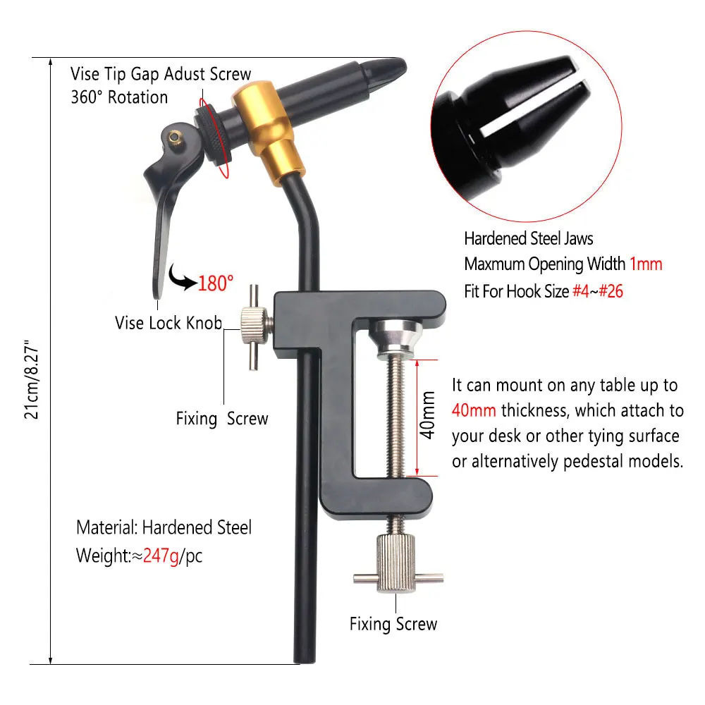 2. Las mordazas de tornillo de banco de leva son fuertes y fáciles de operar y ajustar. El ancho máximo abierto es de aproximadamente 1mm, adecuado para una gama de ganchos de tamaño #26 -#4