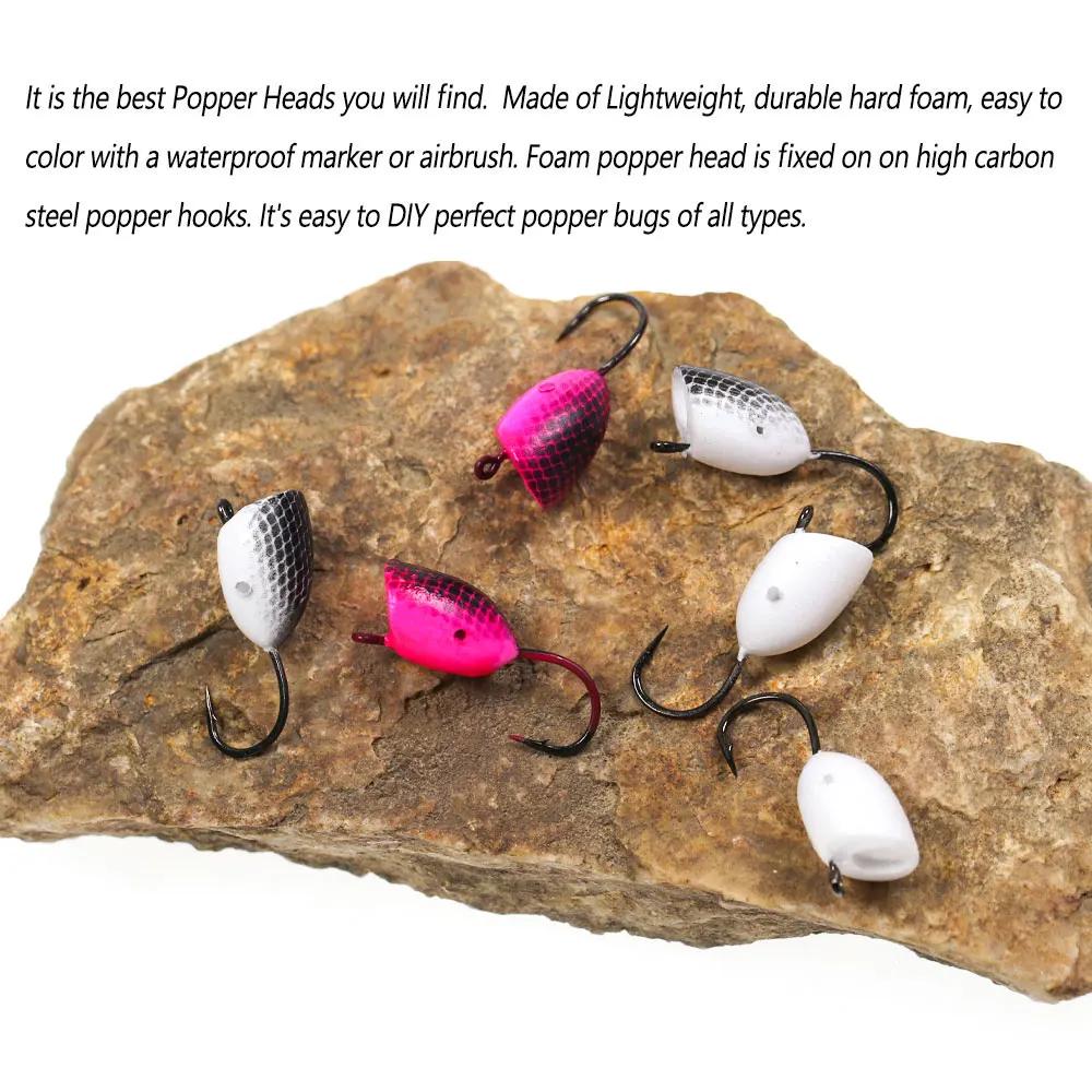 Son las mejores cabezas Popper que encontrarás. Hecho de espuma dura ligera y duradera, fácil de colorear con un marcador impermeable o aerógrafo. La cabeza del popper de espuma se fija en ganchos de acero con alto contenido de carbono. Es fácil de DIY bugs popper perfectos de todo tipo.