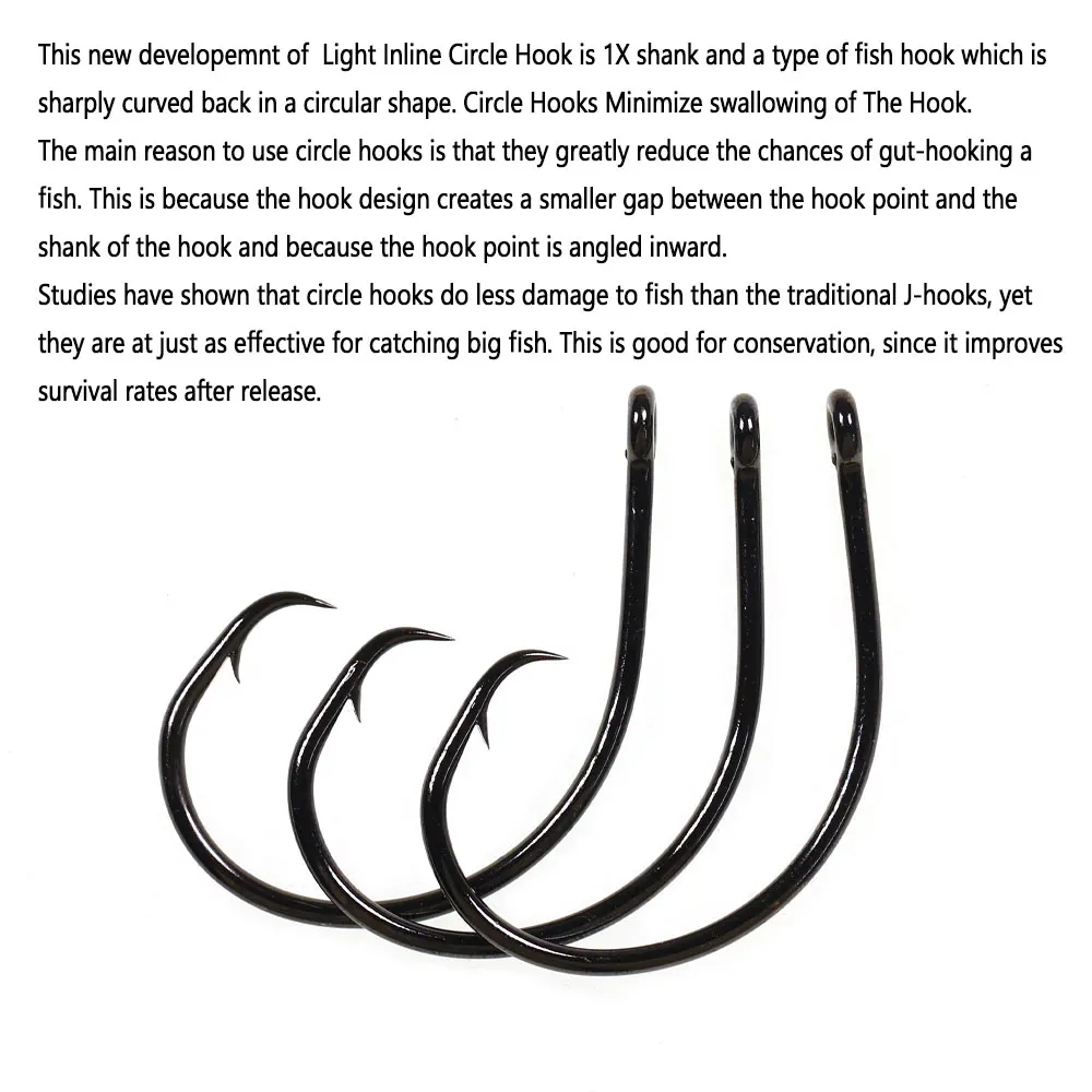 Este nuevo desarrollo de Light Inline Circle Hook es 1X vástago y un tipo de anzuelo que está curvado hacia atrás en forma circular. Los ganchos circulares minimizan la ingestión del gancho. La razón principal para usar anzuelos circulares es que reducen en gran medida las posibilidades de enganchar a un pez. Esto se debe a que el diseño del gancho crea un espacio más pequeño entre el punto del gancho y el vástago del gancho y porque el punto del gancho está inclinado hacia adentro.