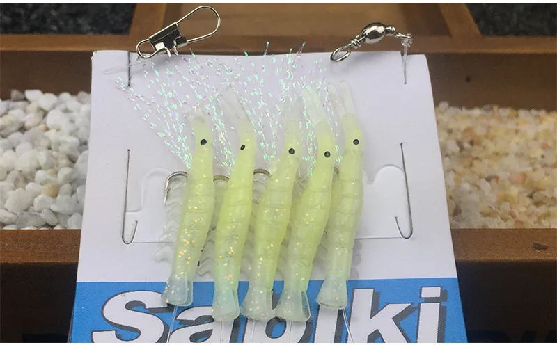Bimoo 5 unids/set anzuelo luminoso para camarones señuelo de pesca Sabiki aparejos con 5 anzuelos pesca en el mar intermitente cebo aparejos señuelo suave ganchos de pesca
