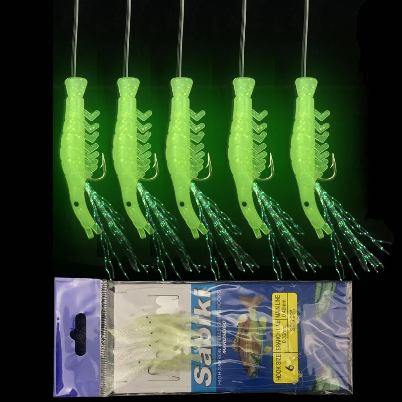 Bimoo 5 unids/set anzuelo luminoso para camarones señuelo de pesca Sabiki aparejos con 5 anzuelos pesca en el mar intermitente cebo aparejos señuelo suave ganchos de pesca
