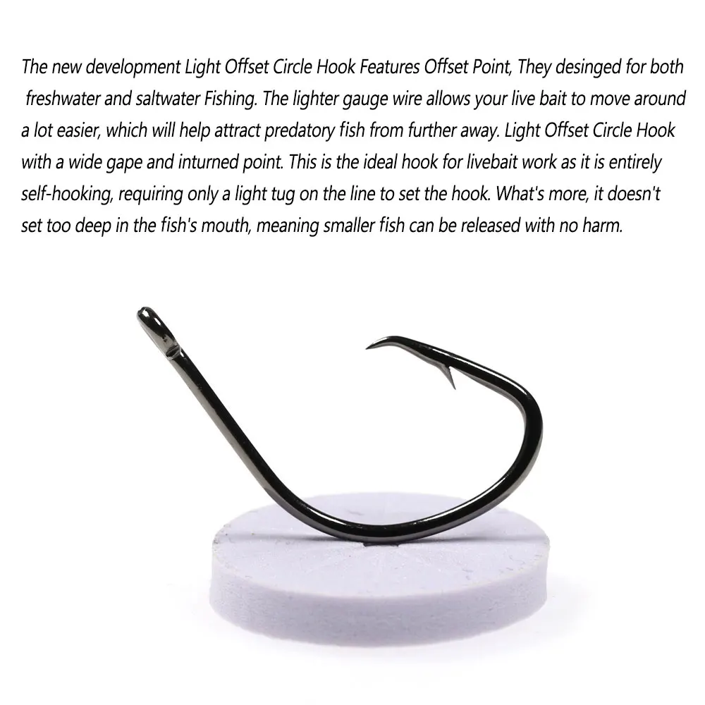 El nuevo desarrollo Light Offset Circle Hook presenta un punto de compensación, diseñado tanto para pesca de agua dulce como salada. El Alambre de calibre más ligero permite que su cebo vivo se mueva mucho más fácilmente, lo que ayudará a atraer peces depredadores de más lejos. Gancho circular compensado ligero con una abertura ancha y un punto invertido. Este es el gancho ideal para el trabajo livebait, ya que se engancha completamente a sí mismo y solo requiere un ligero tirón en la línea para colocar el gancho. Además, no se fija demasiado profundamente en la boca del pez, lo que significa que los peces más pequeños pueden ser liberados sin daños.