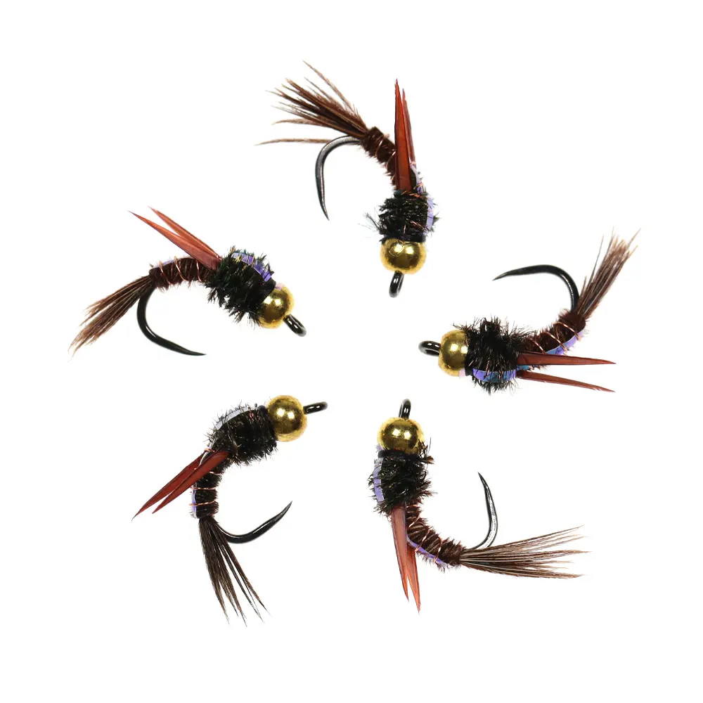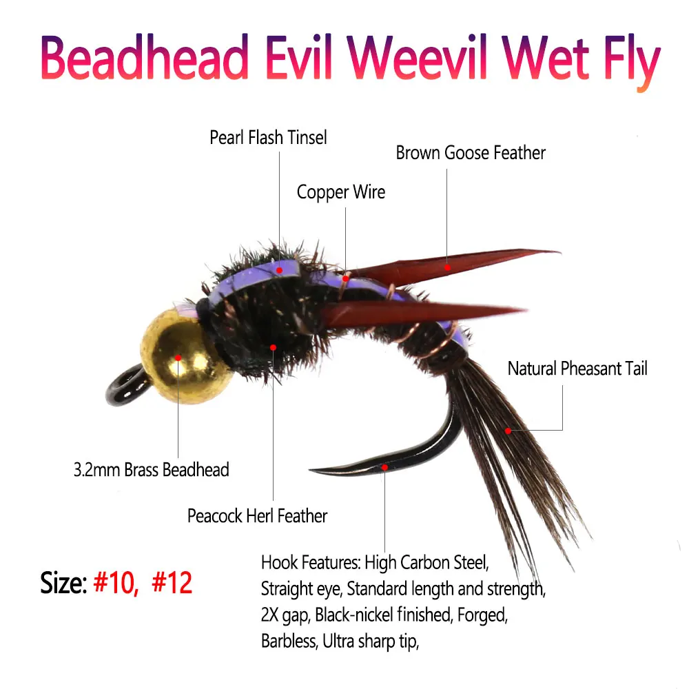 Beadhead Evil Weevil Wet Fly es el favorito de los pescadores occidentales y tiene profundas raíces con el mundialmente famoso río Bow.El patrón original fue desarrollado por Calgary pescador y fly tyer Jeremy Davis.La mosca tiene un perfil ideal para una ninfa con cabeza de cuentas y se ha convertido en un elemento básico para ríos de ninfa de todos los tamaños.Esta versión del mal Weevil es una verdadera mosca de confianza que incluye hackle de plumas de pavo real y un cuerpo de plumas de faisan natural acentuado con una tira trasera de mylar perla.Las moscas están atadas con un gancho de la marca Kona sin púas y afilado con cuentas de latón.El cuerpo de plumas de faisão natural crea una apariencia natural de gases abdominales atrapados que a menudo se ven en los insectos acuáticos emergentes.