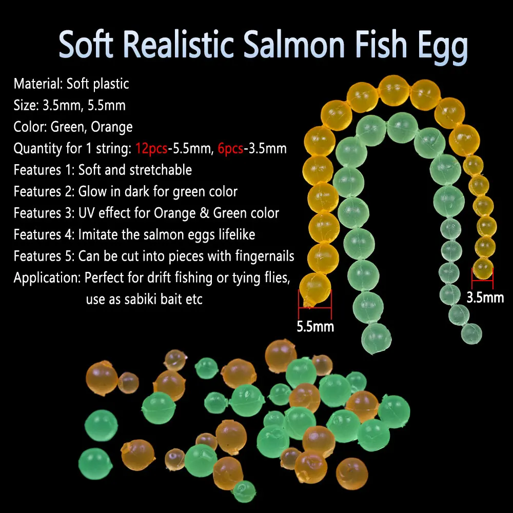 Estos huevos de salmón de plástico blando son excelentes para la pesca a la deriva o para atar moscas. Funcionan muy bien para truchas, truchas, salmones y todos los demás huevos que consumen especies de peces. Lanza algo nuevo al pez con estos huevos personalizados.