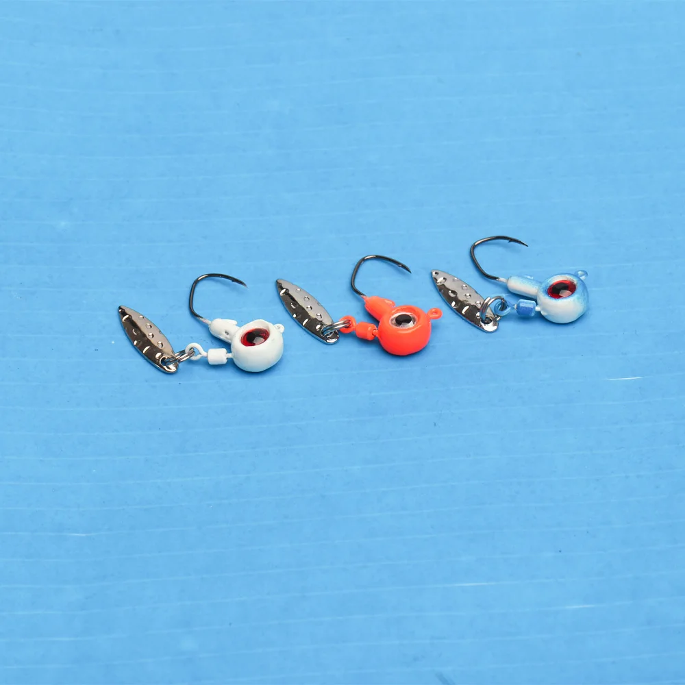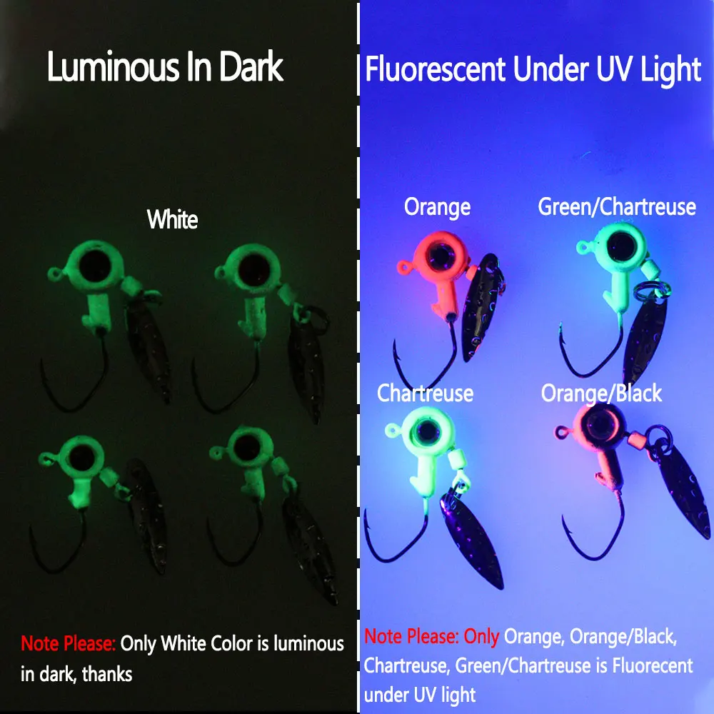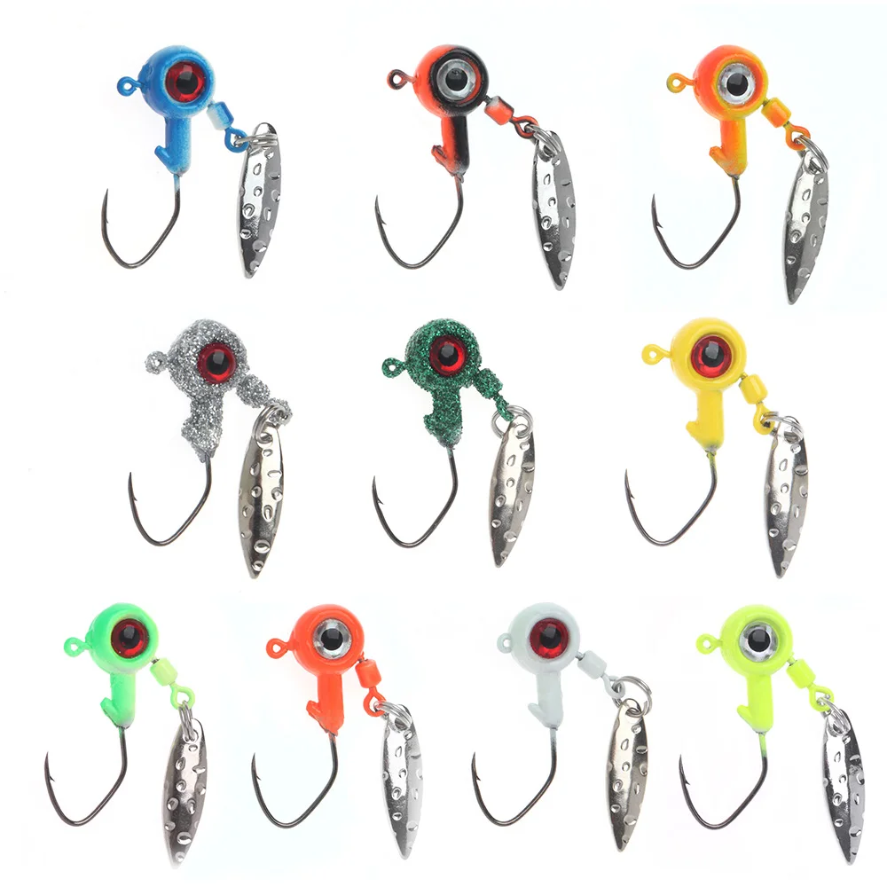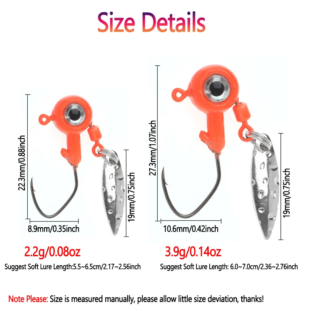 Diseño único: los anzuelos de pesca están diseñados con grandes ojos brillantes y un accesorio de hoja, este último puede girar en el agua y proporcionar una gran cantidad de destellos brillantes, lo que puede atraer a más peces, todo el conjunto de pesca es práctico de usar en el exterior.