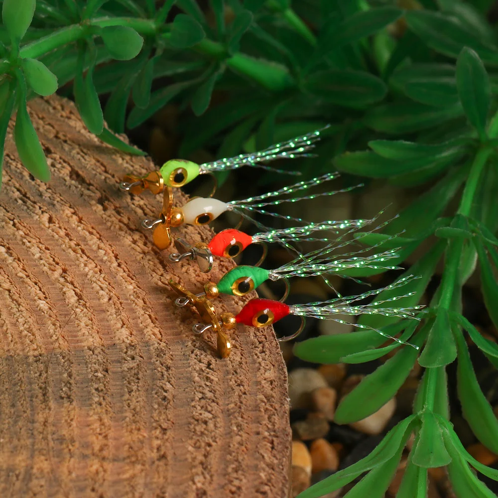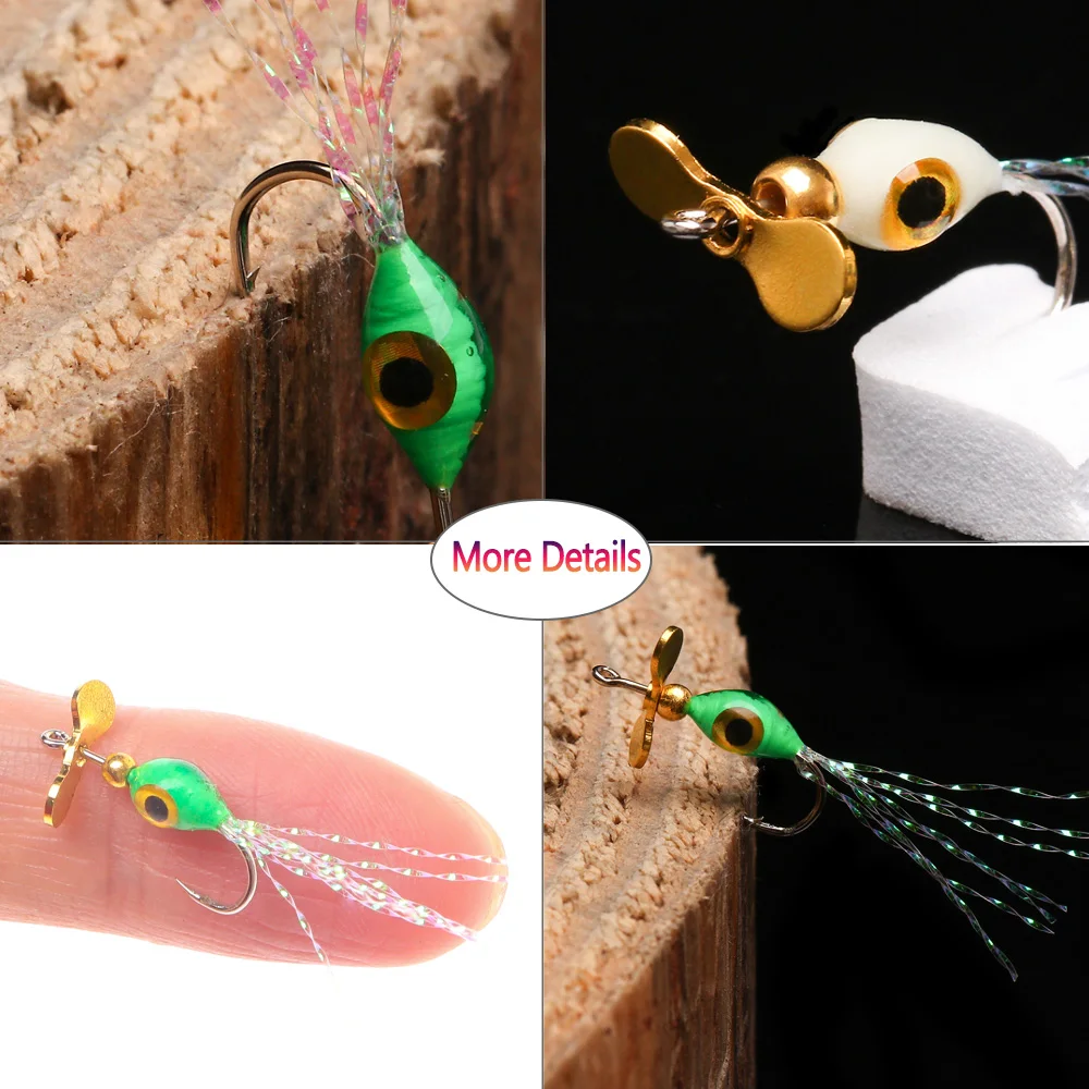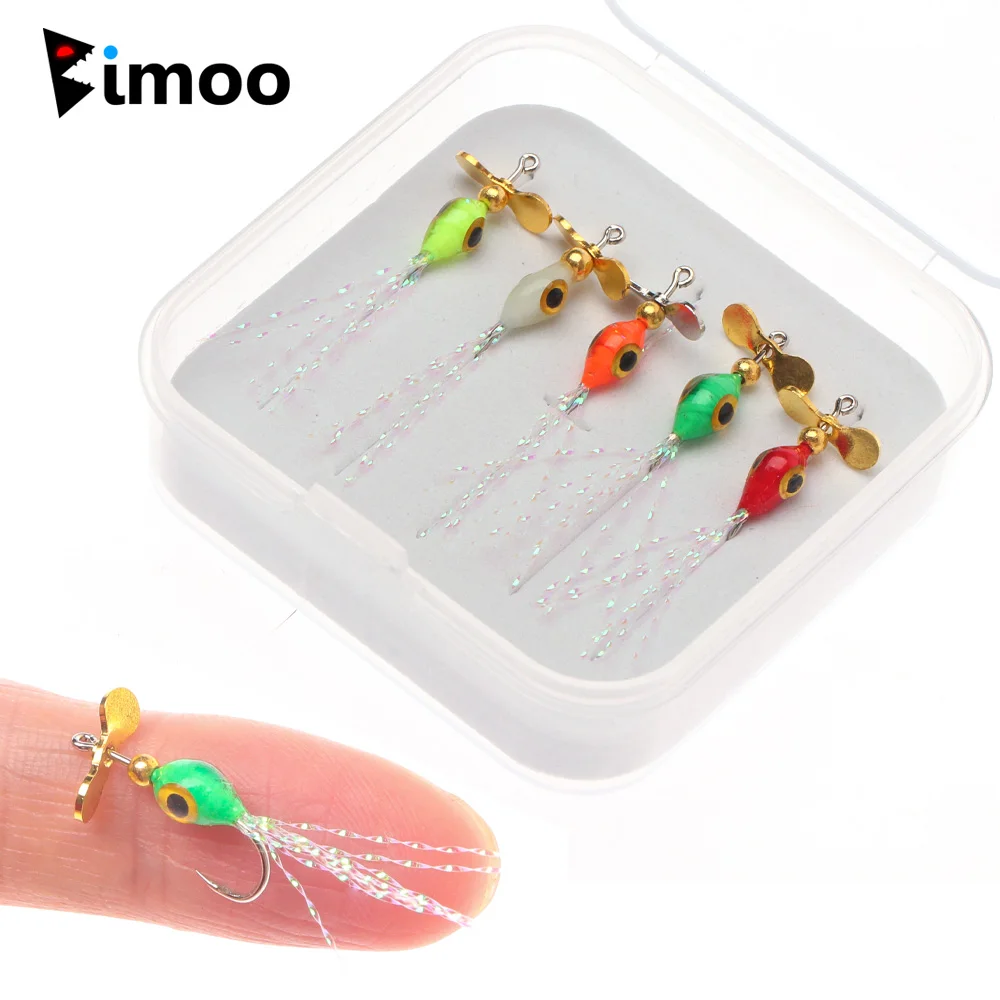 Bimoo cebo de pez pequeño Natural anzuelos de mosca hélice de pesca con mosca lentejuelas ojos de pez 3D epoxi Ninfa mosca Minnow mosca trucha señuelo de pesca