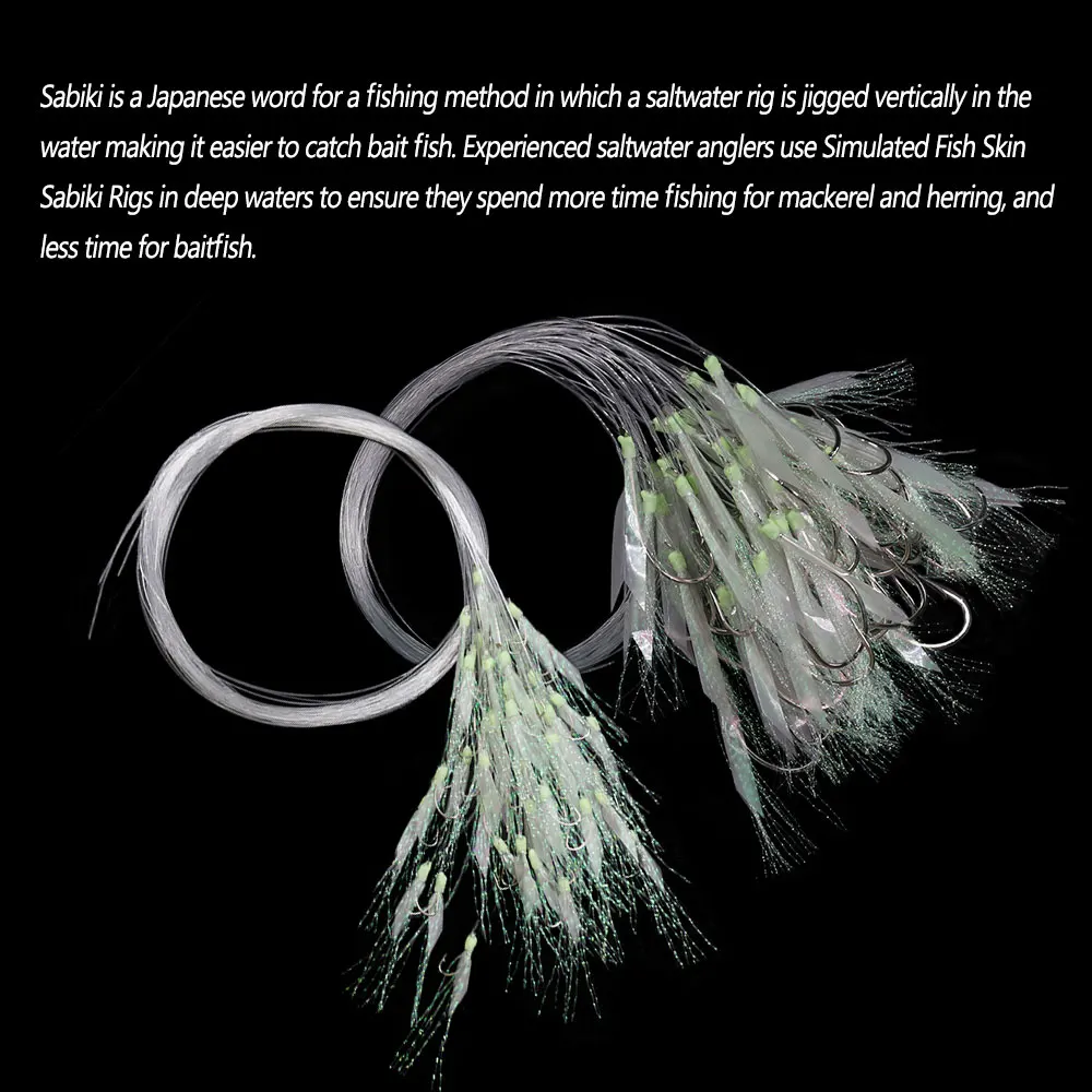 Sabiki es una palabra japonesa para un método de pesca en el que una plataforma de agua salada se mueve verticalmente en el agua, lo que facilita la captura de peces de cebo. Los pescadores experimentados de agua salada utilizan plataformas Sabiki de piel de pez simulada en aguas profundas para asegurarse de que pasan más tiempo pescando caballa y arenque y menos tiempo para cebo.