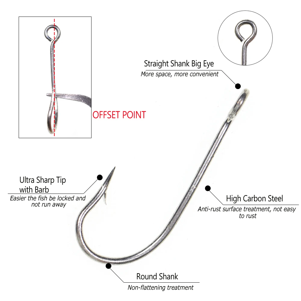 El anzuelo es muy afilado, súper fuerte, especialmente adecuado para la pesca en barcos de mar. La superficie del gancho está chapada en estaño para evitar el óxido y la corrosión en agua salada.