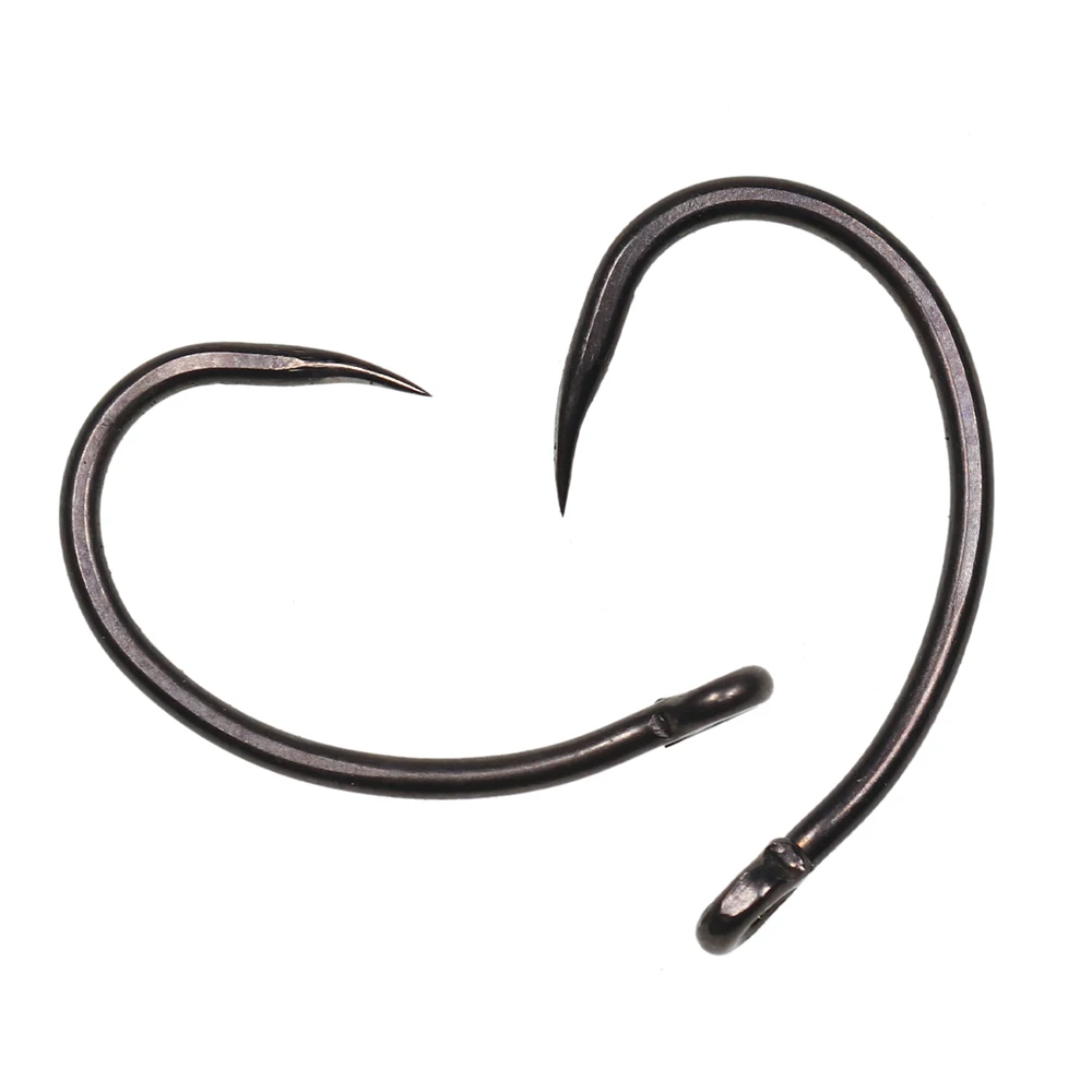 Super sharp and durable, it is made of high quality carbon steel. Curved shank, barbless,wide gap, forged shank,offset point.