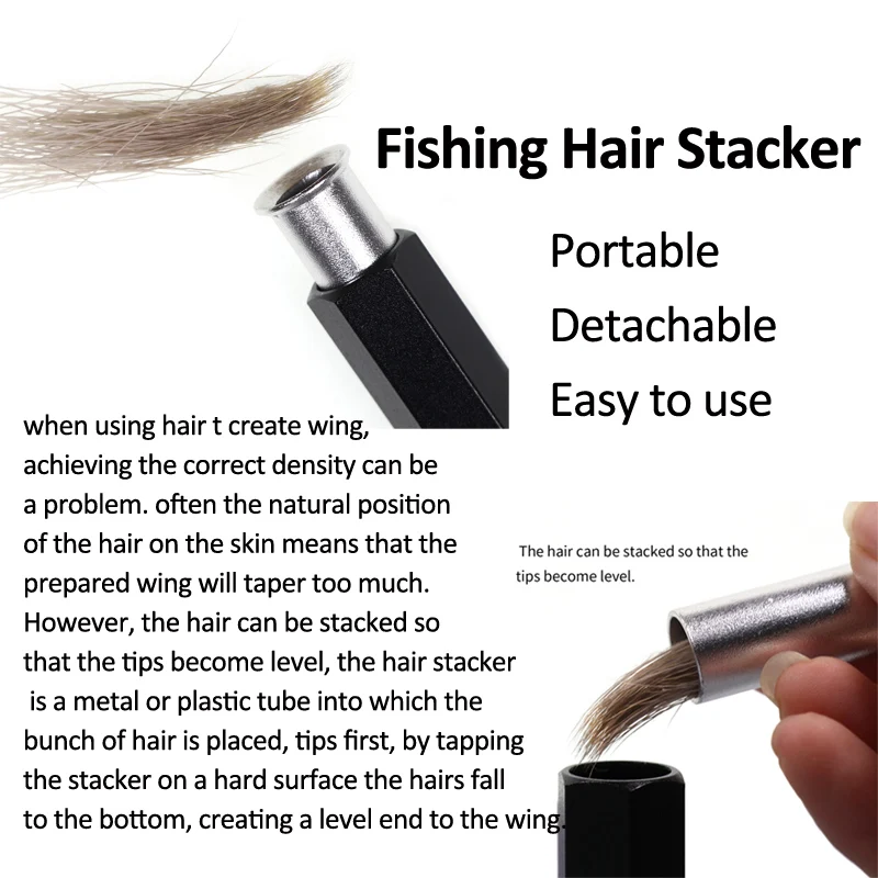 ●Cuando se usa cabello, crea alas, lograr la densidad correcta puede ser un problema.A menudo, la posición natural del cabello en la piel significa que el ala preparada se tapará demasiado.Sin embargo, el cabello se puede apilar para que las puntas queden niveladas, el apilador de cabello es un tubo de metal o plástico en el que se coloca el mechón de cabello, consejos primero, golpeando el apilador sobre una superficie dura los pelos caen hasta el fondo. creando un extremo nivelado al ala.