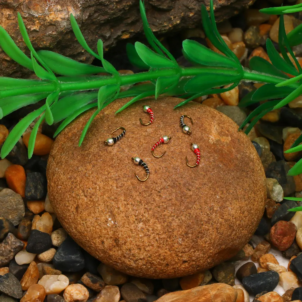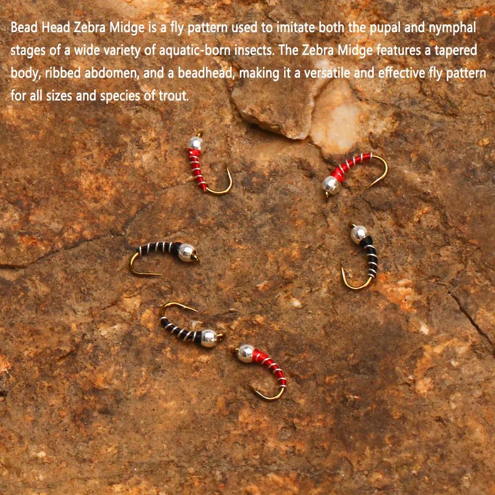 Bead Head Zebra Midge es un patrón de mosca que se utiliza para imitar tanto las etapas pupital como la ninfa de una amplia variedad de insectos recién nacidos acuáticos.El Zebra Midge presenta un cuerpo cónico, abdomen acanalado y una cabeza de cuentas, lo que lo convierte en un patrón de mosca versátil y eficaz para todos los tamaños y tipos de truchas.