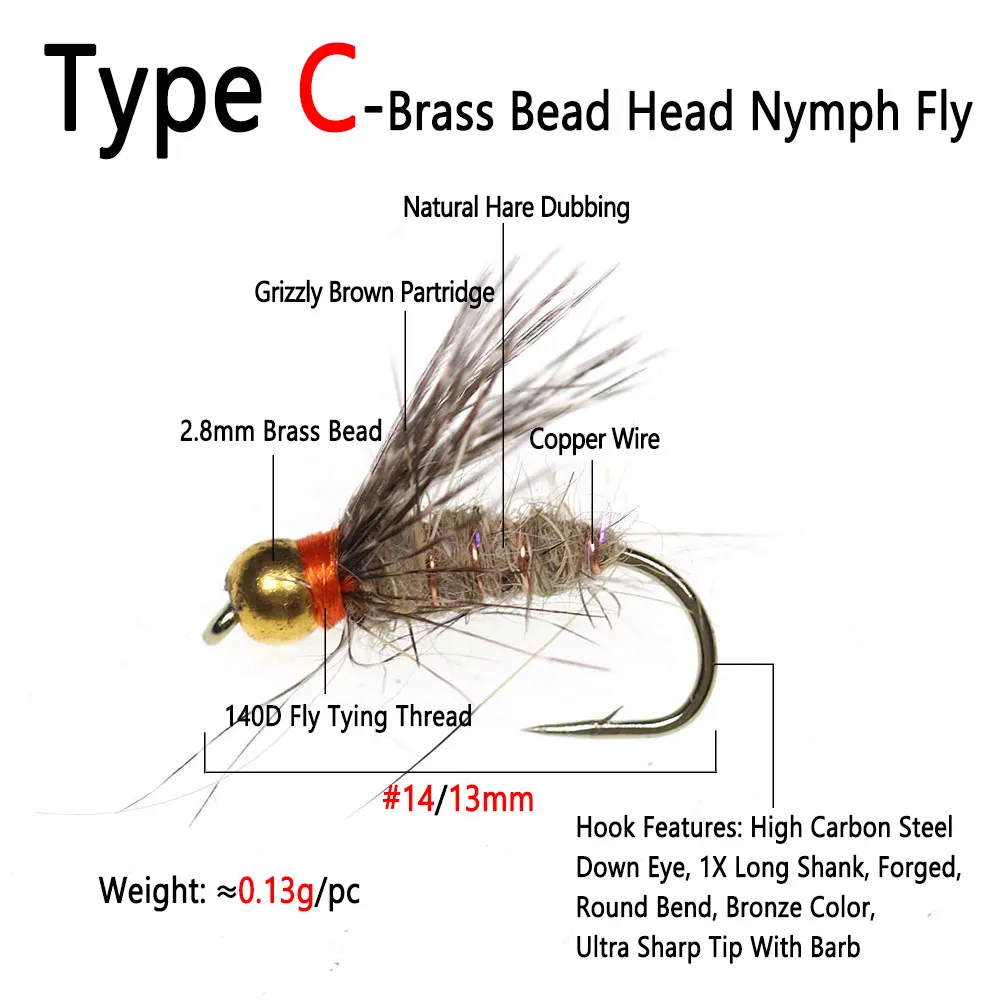 Mosca de ninfa con cabeza de cuentas de latón tipo B y tipo C