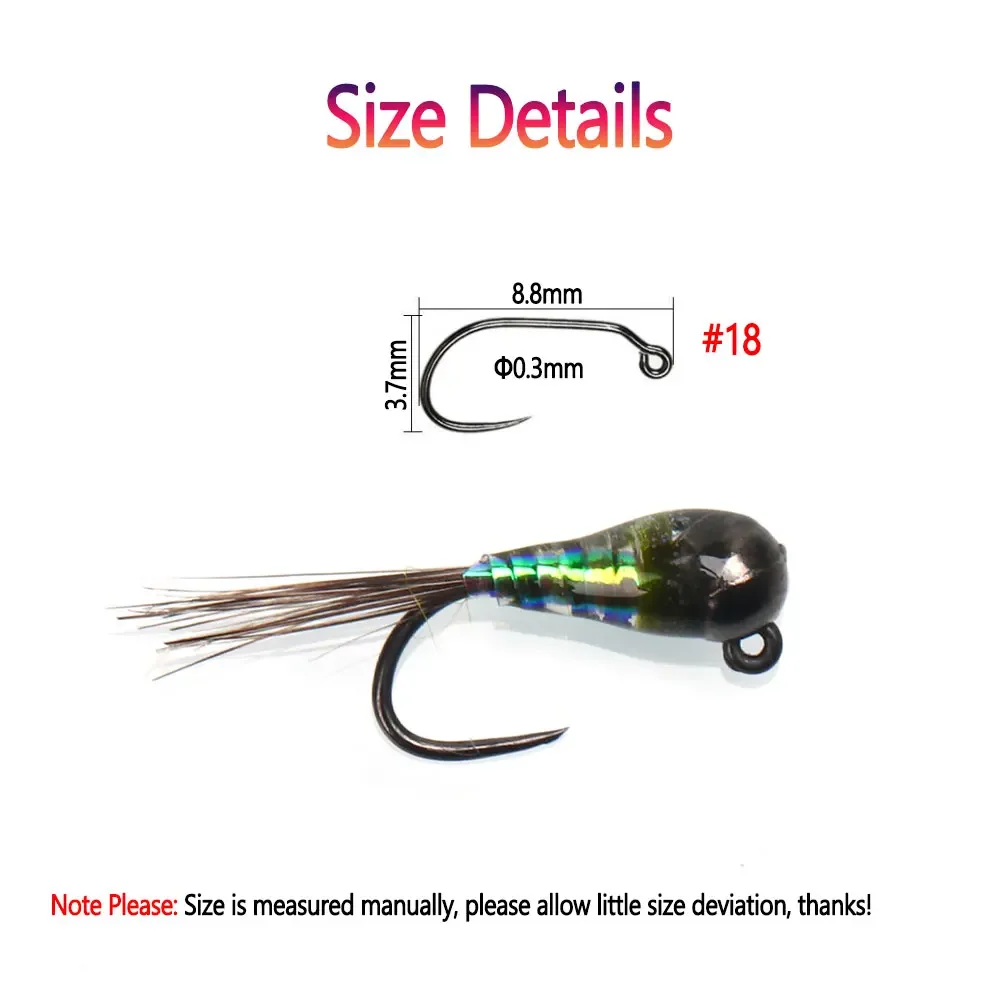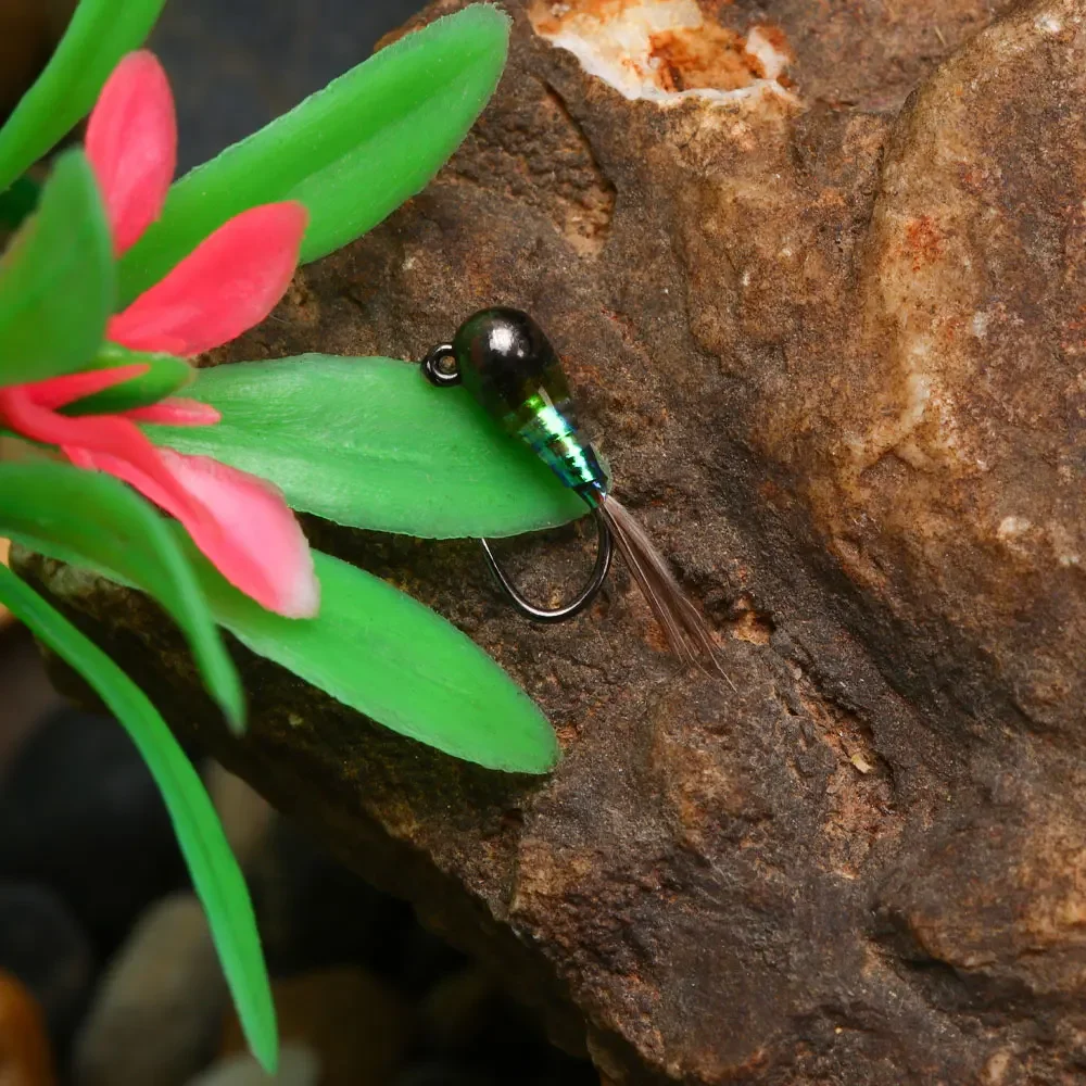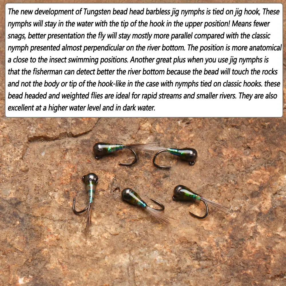 El nuevo desarrollo de ninfas de plantilla de cabeza de cuentas de tungsteno está atado en gancho de plantilla, ¡Estas ninfas permanecerán en el agua con la punta del gancho en la posición superior! Significa menos inconvenientes, mejor presentación, la mosca se mantendrá en su mayoría más paralela en comparación con la ninfa clásica presentada casi perpendicular en el fondo del río. La posición es más anatómica cerca de las posiciones de natación de insectos. Otra gran ventaja cuando usa ninfas de plantilla es que el pescador puede detectar mejor el fondo del río porque la cuenta tocará las rocas y no el cuerpo o la punta del anzuelo, en el caso con ninfas atadas en ganchos clásicos. Estas moscas con cabeza de perla y peso son ideales para arroyos rápidos y ríos más pequeños. También son excelentes en un nivel de agua más alto y en aguas oscuras.
