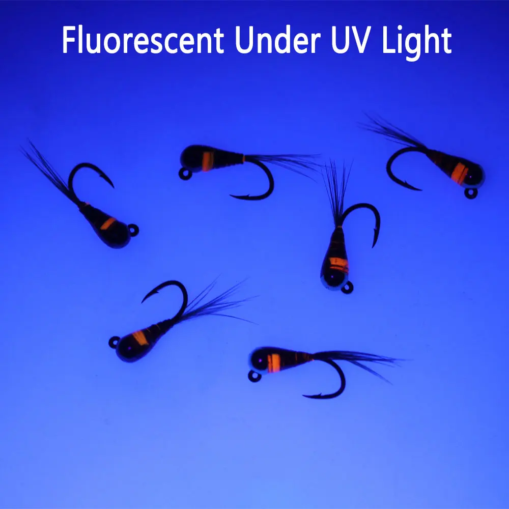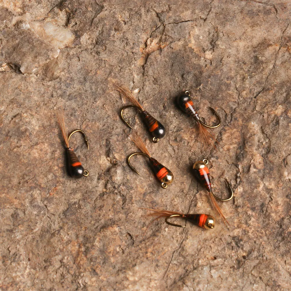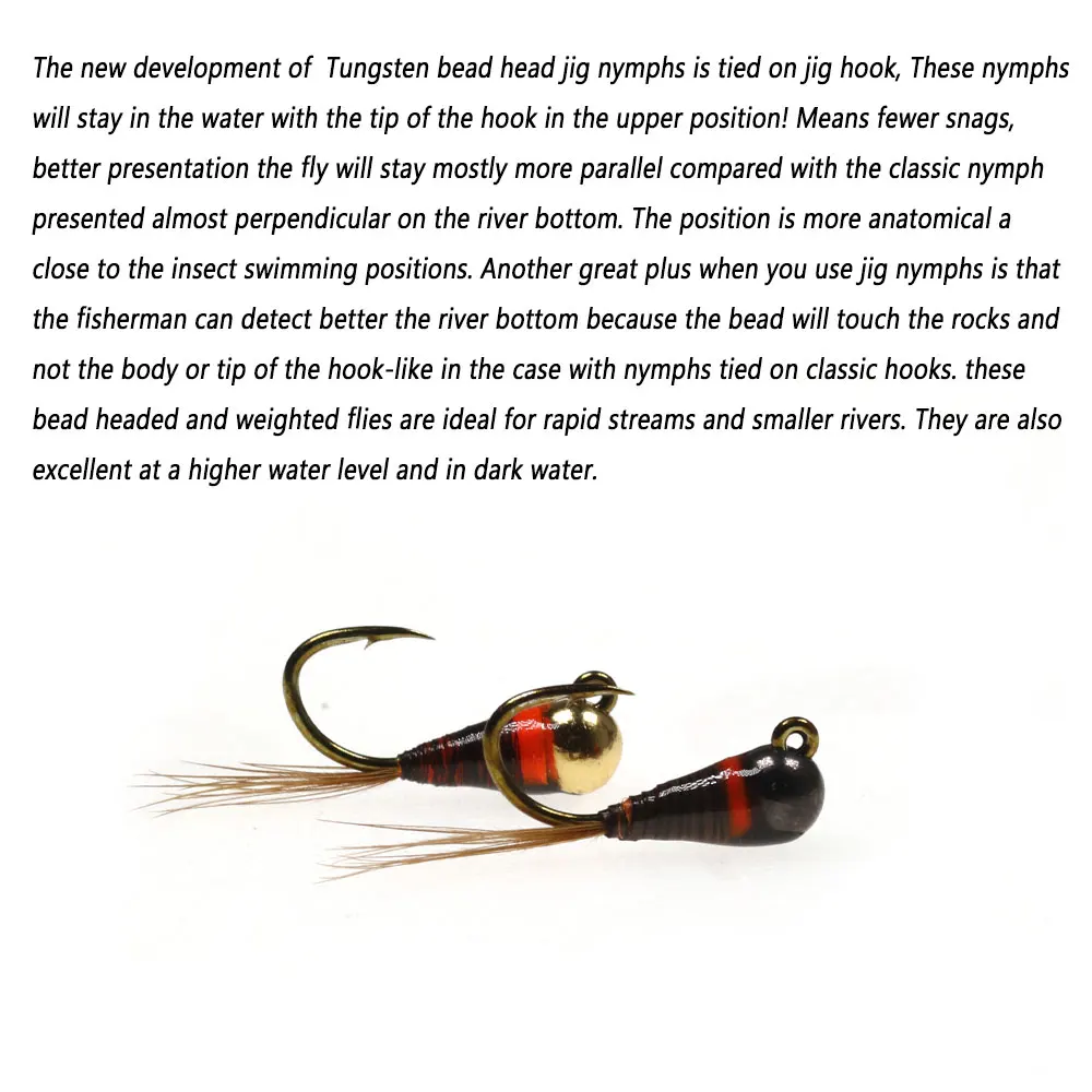 El nuevo desarrollo de las Ninfas de plantilla de cabeza de cuentas de tungsteno está atado en el gancho de plantilla, ¡Estas ninfas permanecerán en el agua con la punta del gancho en la posición superior! Significa menos enganches, Mejor Presentación La Mosca se mantendrá mayormente más paralela en comparación con la ninfa clásica presentada casi perpendicular en el fondo del río. La posición es más anatómica y cercana a las posiciones de natación de insectos. Otra gran ventaja cuando usas ninfas de plantilla es que el pescador puede detectar mejor el fondo del río porque la cuenta tocará las rocas y no el cuerpo o la punta del anzuelo en el caso con ninfas atadas en ganchos clásicos. Estas moscas con cabeza de perla y peso son ideales para arroyos rápidos y ríos más pequeños. También son excelentes en un nivel de agua más alto y en agua oscura.