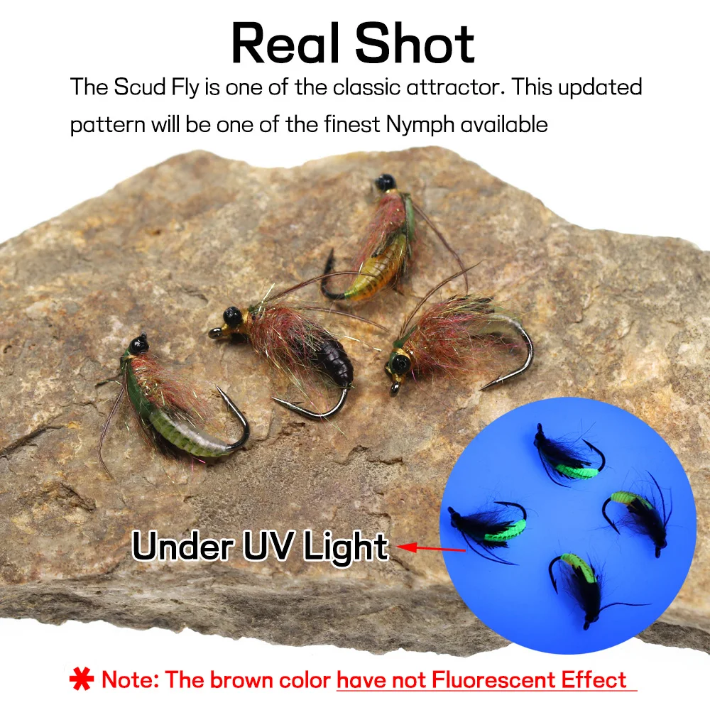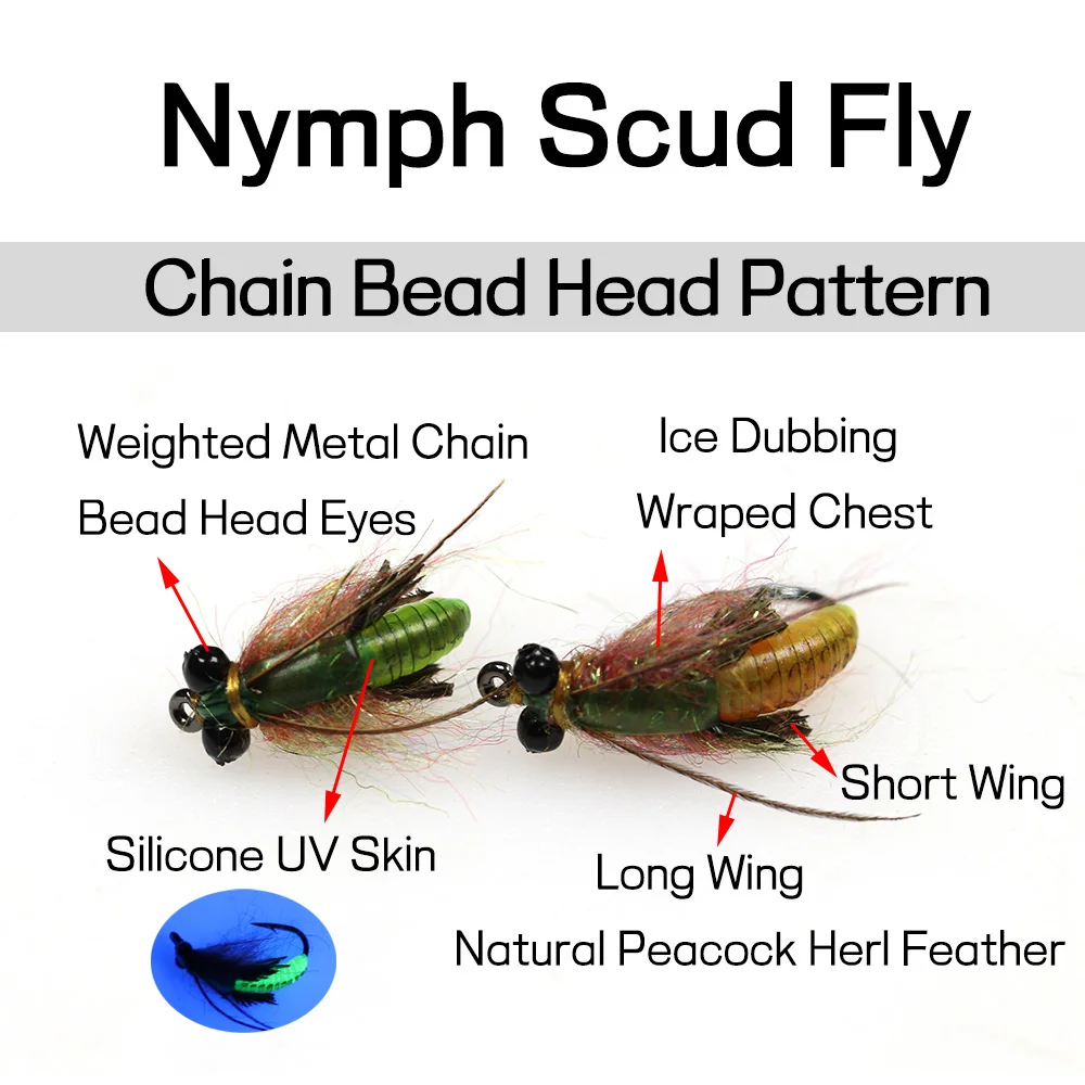 Estas cuentas de cadena Nymph Scud Fly se hundirán rápidamente. El pecho envuelto en alas de hielo, las piernas peludas y la piel fluorescente de la espalda hacen que el Scud vuele sea difícil de ignorar como un conocedor de moscas... Y difícil de ignorar para los peces como una comida fácil