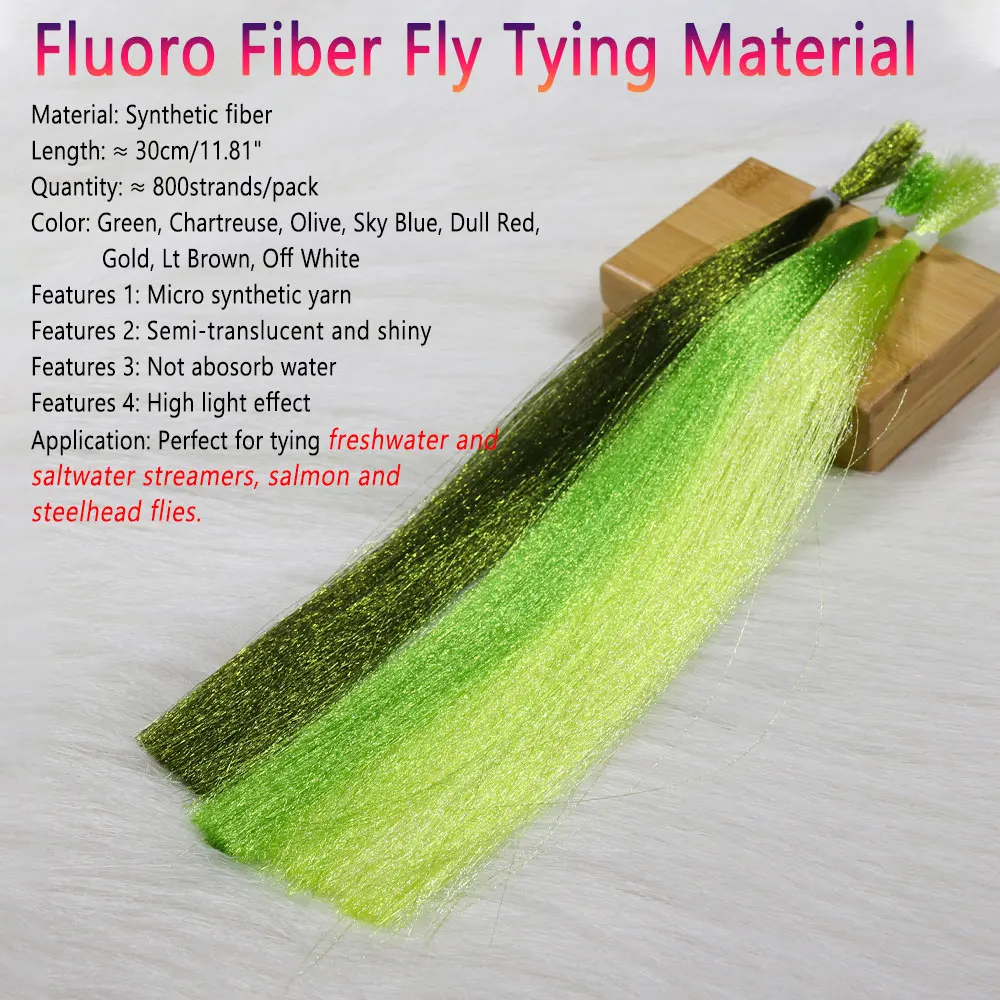 Fluoro Fiber es un tipo de fibra sintética fina y sus colores reflejan la luz y son semitranslúcidos y brillantes.Esta microfibra sintética "se iluminará" en el agua.Un material perfecto para agregar reflejos a los materiales para atar moscas de agua salada.También nos gusta atar colas y etiquetas tanto en serpentinas de agua dulce como salada, salmón y