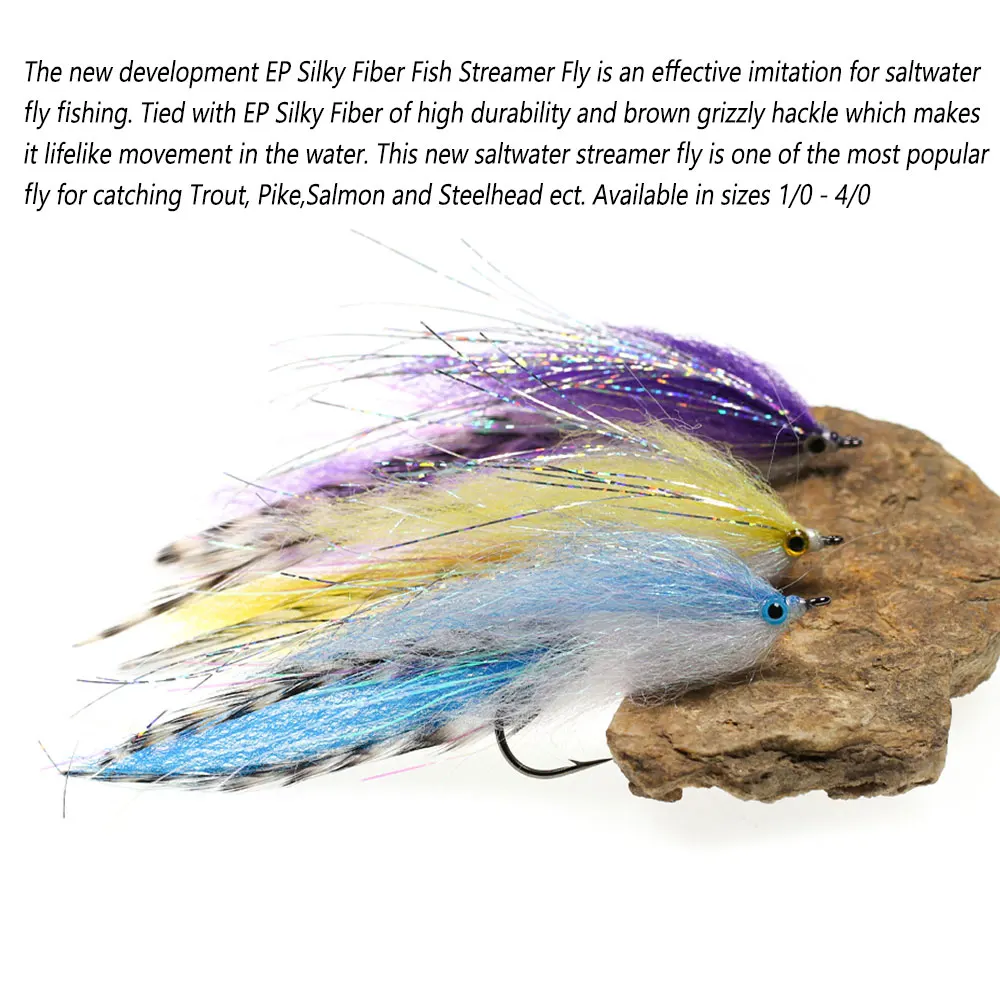 El nuevo desarrollo EP Silky Fiber Fish Streamer Fly es una imitación efectiva para la pesca con mosca de agua salada. Atado con fibra sedosa EP de alta durabilidad y hackle Grizzly marrón que lo hace un movimiento realista en el agua. Esta Nueva mosca de serpentina de agua salada es una de las moscas más populares para la captura de trucha, Lucio, salmón y trucha arco iris, etc. Disponible en tallas 1/0 - 4/0