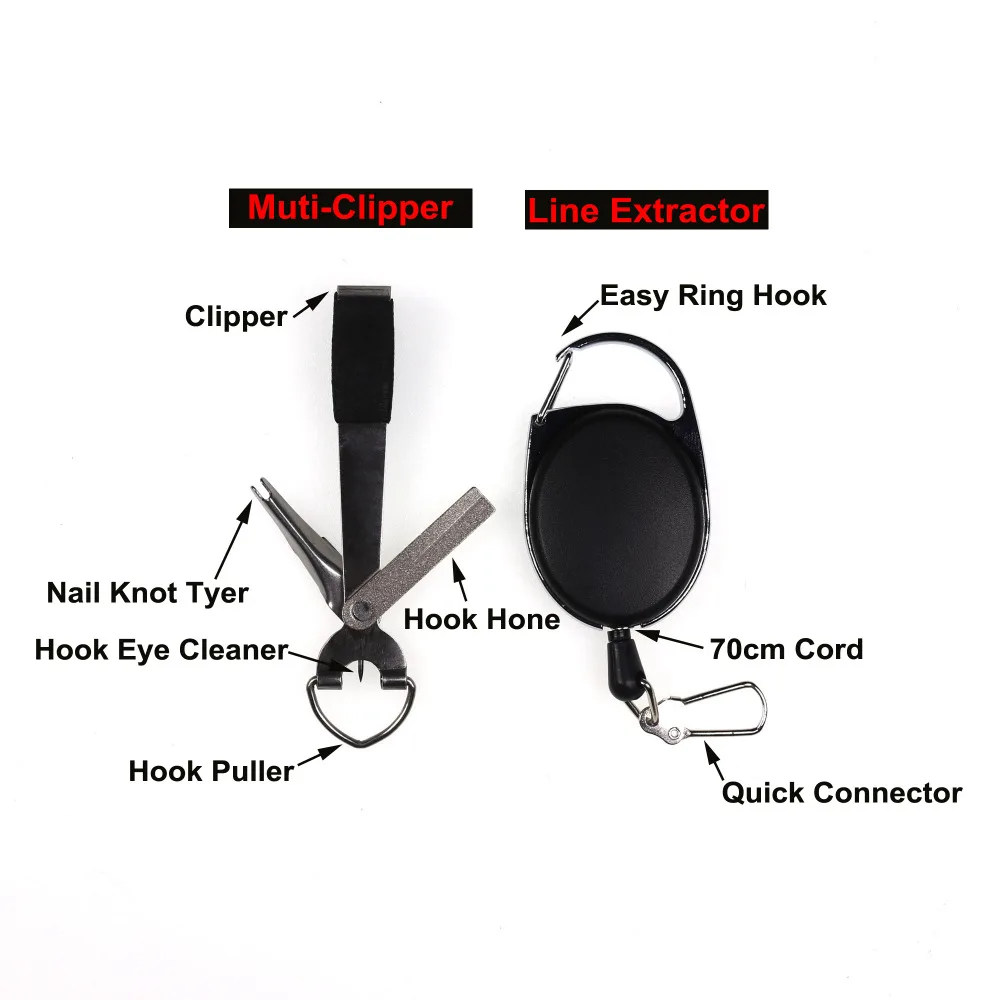 Specifications:-Multiple Purpose High Carbon Steel Clippers with integrated knotting tool and hook eye cleaning needle;-With Line extractor with 70cm cable, with loop holder and belt holder (Optional)