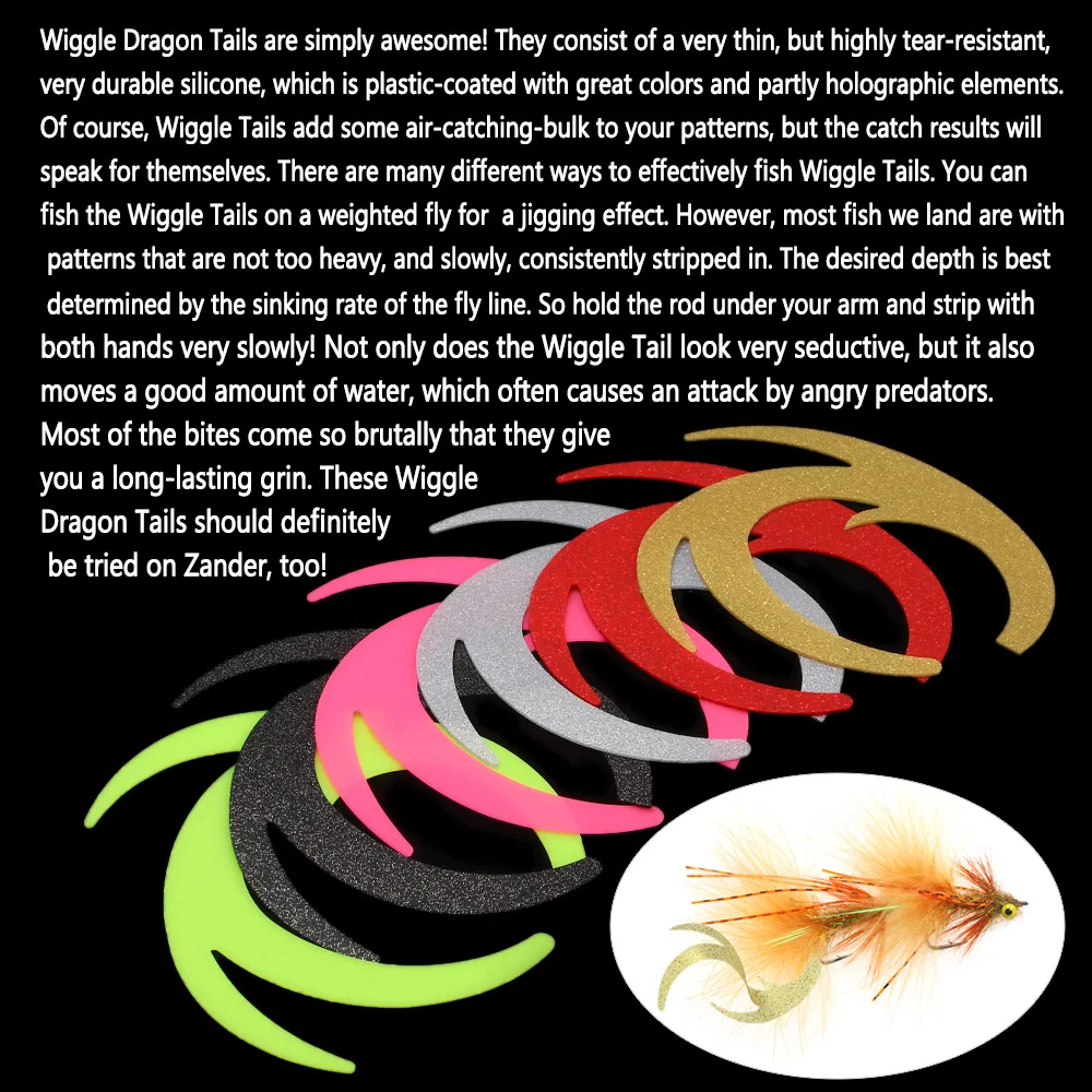Silicona muy duradera, recubierta de plástico con excelentes colores y parte elementos holográficos.Por supuesto, Wiggle Tails añade algo de volumen llamativo a tus patrones, pero los resultados de la captura hablarán por sí mismos.Hay muchas maneras diferentes de pescar eficazmente Wiggle Tails.Puedes pescar los Wiggle Tails en una mosca con peso para obtener un efecto jigging.Sin embargo, la mayoría de los peces que atenemos tienen patrones que no son demasiado pesados y que lentamente se desprenden constantemente.La profundidad deseada se determina mejor por la tasa de hundimiento de la línea de mosca.¡Así que sujeta la varilla debajo de tu brazo y tira con ambas manos muy lentamente!La cola de Wiggle no solo parece muy seductora, sino que también mueve una buena cantidad de agua, lo que a menudo provoca un ataque de los depredadores enojados.