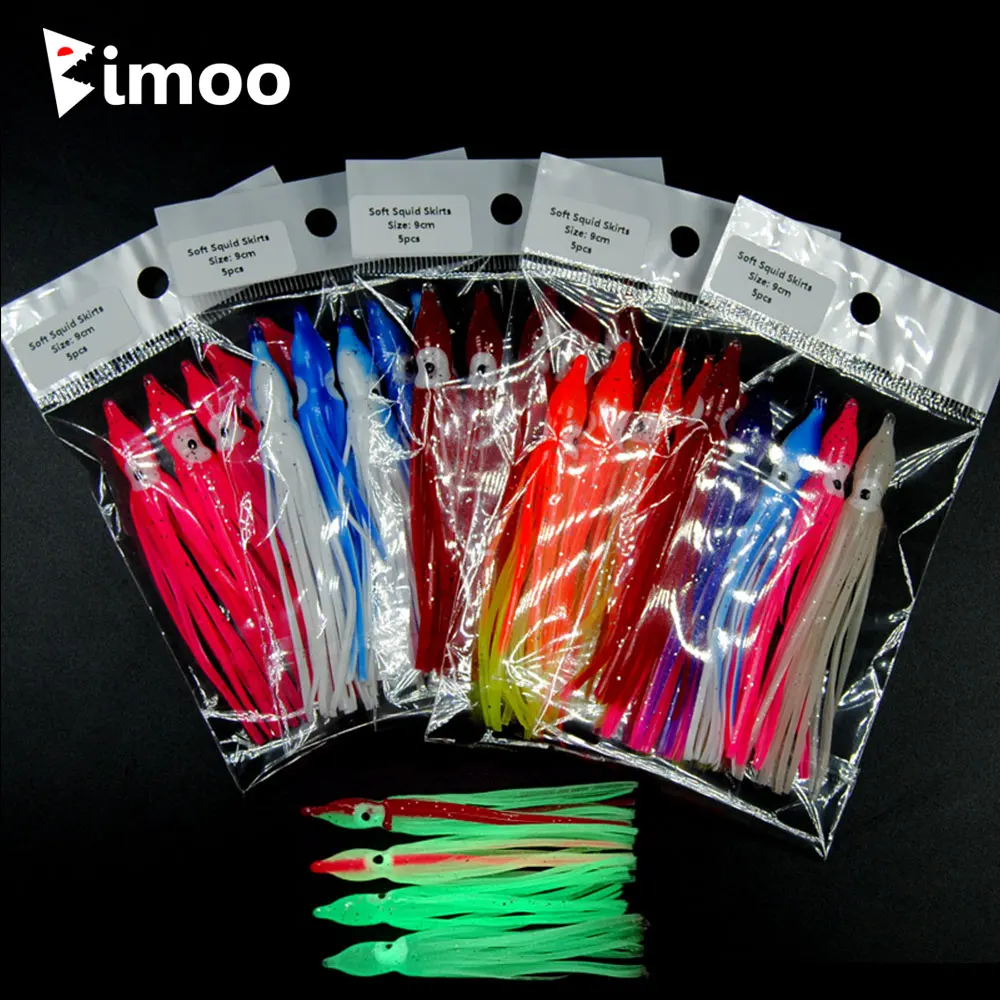 Bimoo 2 bolsas=10 cm 9cm faldas de calamar suave naranja rojo azul luminoso plástico pulpo falda agua salada Señuelos de Pesca cebos