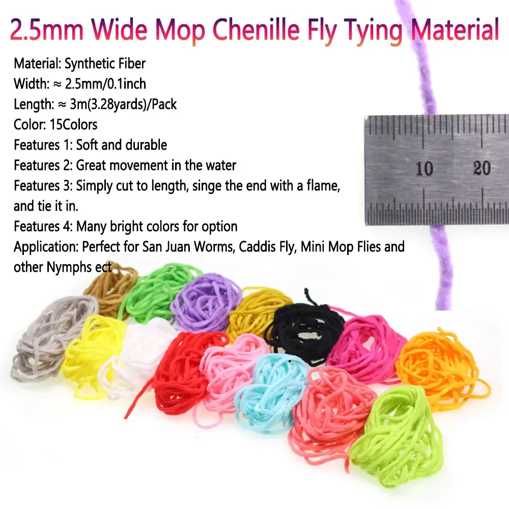 Bimoo 3 metros/paquete, fregona de 2,5mm de ancho, Material de atado de moscas de chenilla para gusano Squirmy, ninfas Caddis, fregona pequeña, moscas, Señuelos de pesca de trucha