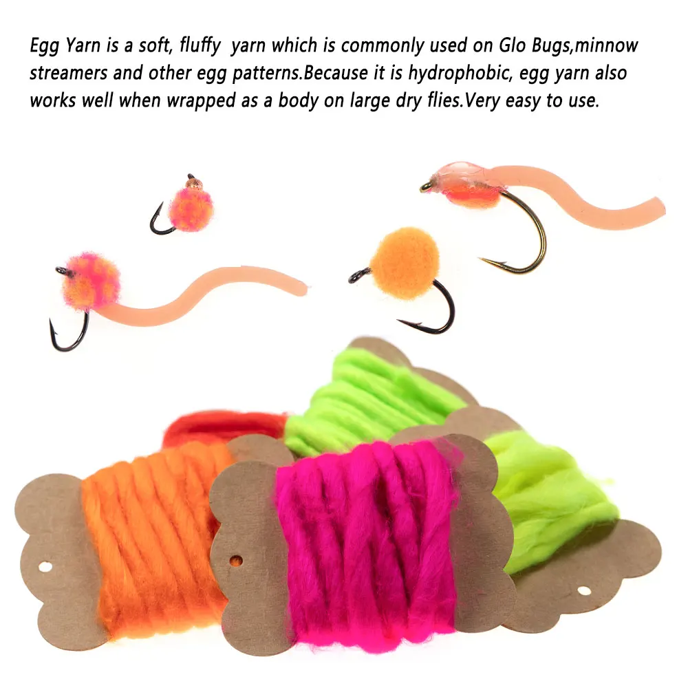 Egg Fil es un hilo suave y esponjoso que se usa comúnmente en Glo Bugs, serpentinas de pececillos y otros patrones de huevos. Debido a que es hidrofóbico, el hilo de huevo también funciona bien cuando se envuelve como un cuerpo en grandes moscas secas. Muy fácil de usar.