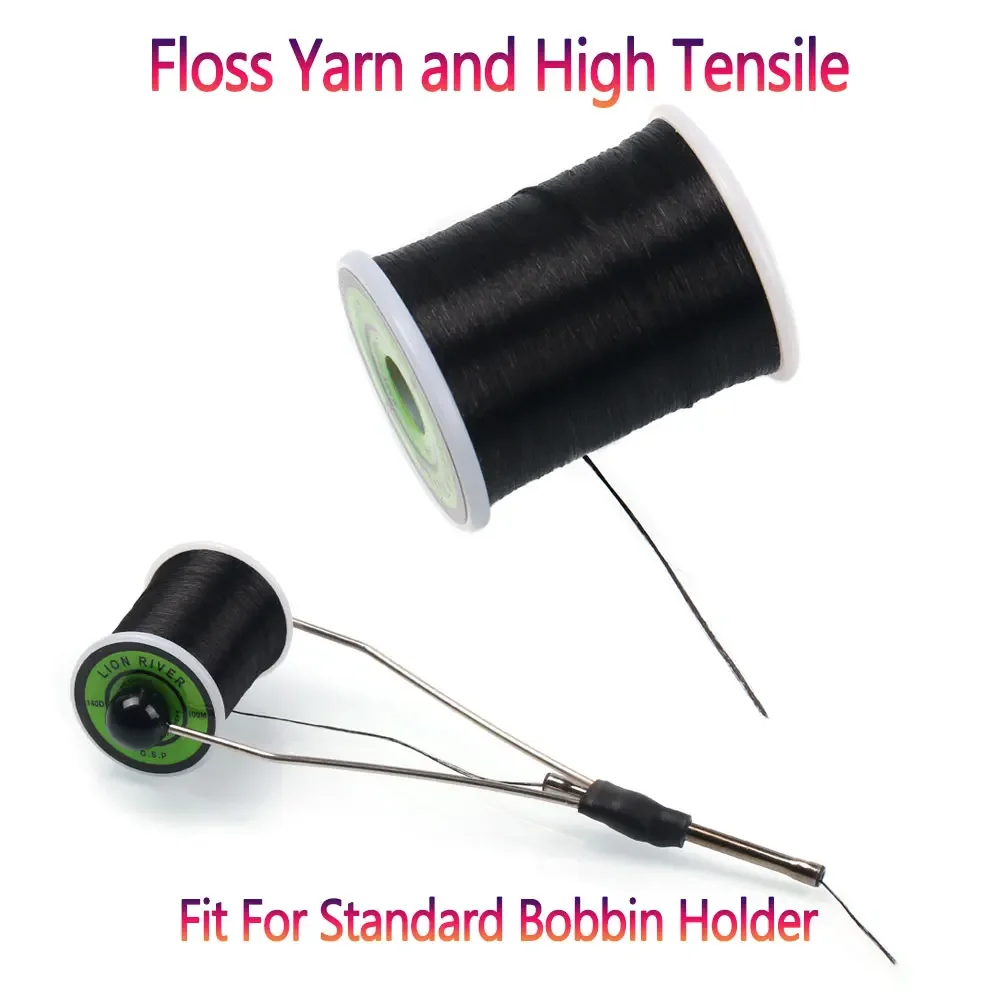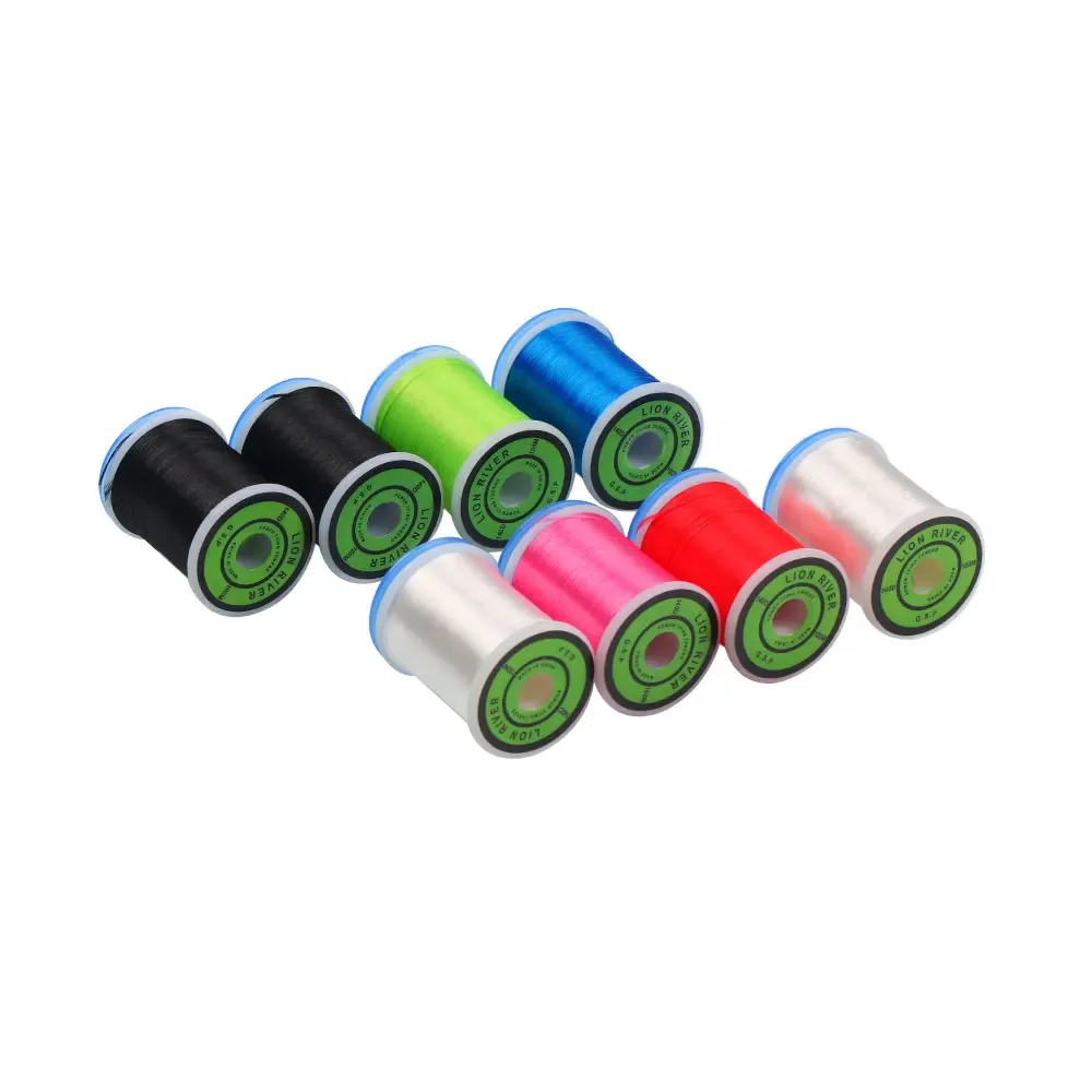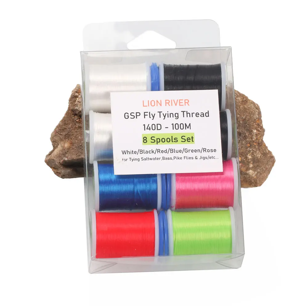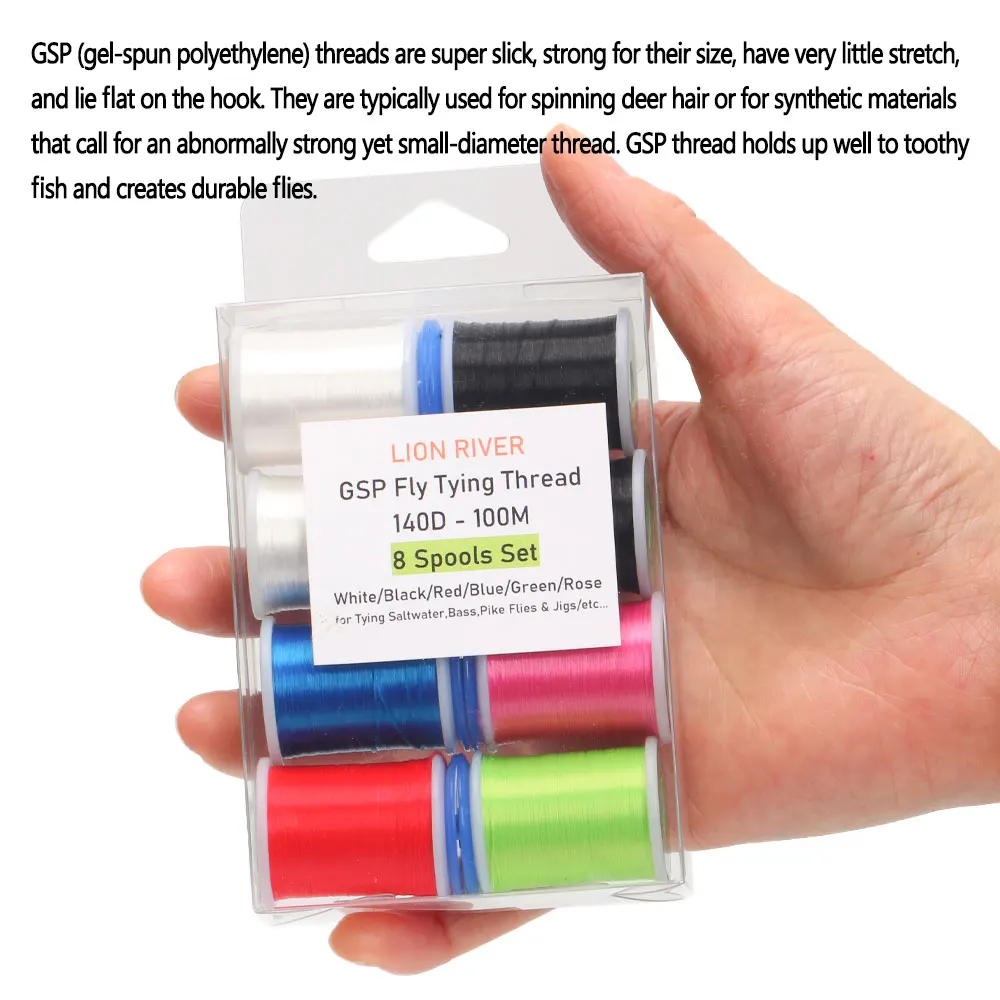 Los hilos GSP (polietileno hilado en gel) son súper resbaladizos, fuertes para su tamaño, tienen muy poco estiramiento y se encuentran planos en el gancho. Por lo general, se utilizan para hilar pelo de ciervo o para materiales sintéticos que requieren un hilo anormalmente fuerte pero de diámetro pequeño. El hilo GSP sostiene bien a los peces con dientes y crea moscas duraderas.