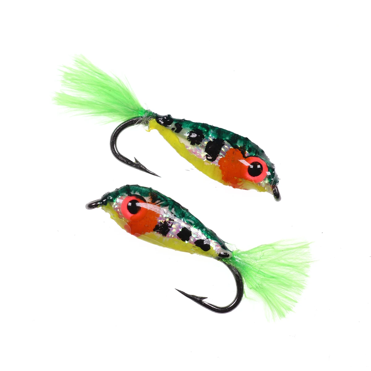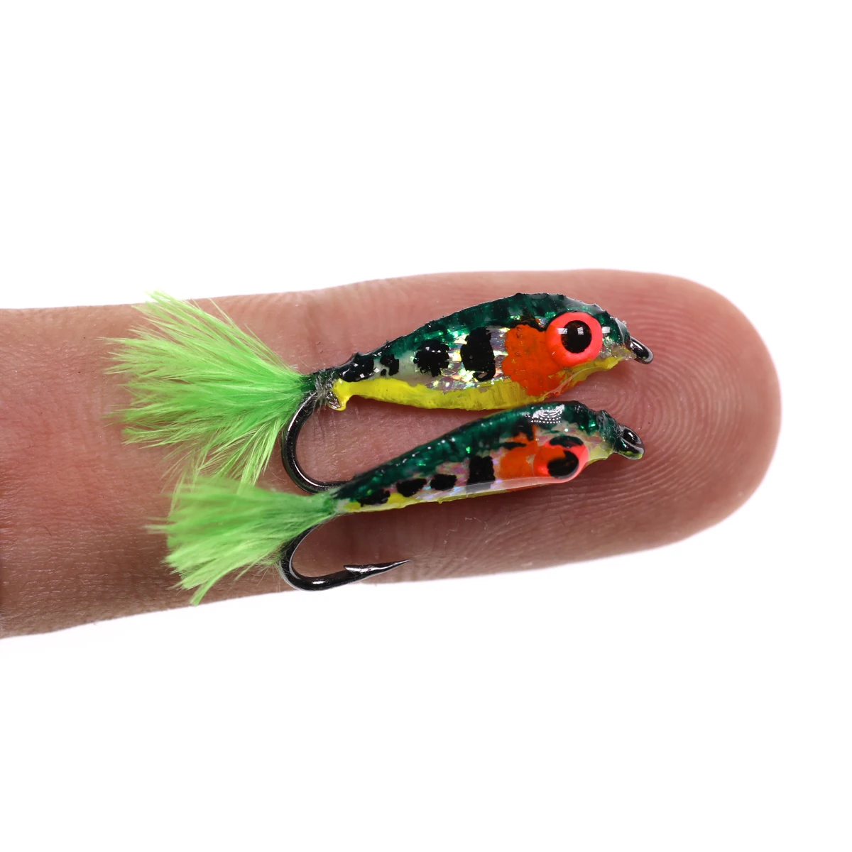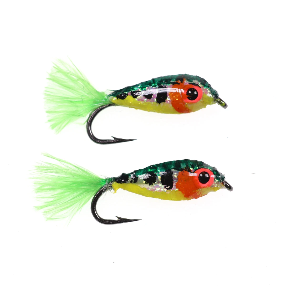 Bimoo 2 piezas #10 Mini cebo pececillos trucha mosca pesca moscas señuelos serpentinas con ojos brillantes 3D pequeño cebo peces imitación