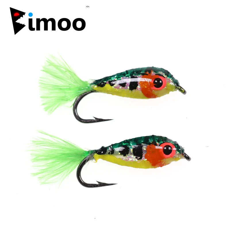 Bimoo 2 piezas #10 Mini cebo pececillos trucha mosca pesca moscas señuelos serpentinas con ojos brillantes 3D pequeño cebo peces imitación