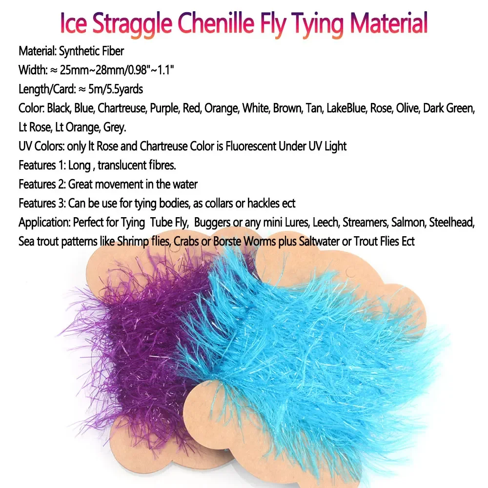 Altamente móvil con flúor y colores naturales, Ice Straggle Chenille es un material muy versátil para patrones de salmón, trucha arco iris, trucha marina como moscas de Camarón, cangrejos o gusanos borste, además de moscas de agua salada o trucha.