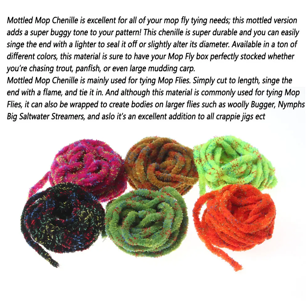Mottled Mop Chenille es excelente para todas sus necesidades de atado de moscas con trapeador; ¡Esta versión moteada agrega un tono súper buggy a tu patrón!Esta chenilla es súper duradera y puedes cantar fácilmente el extremo con un encendedor para sellarla o alterar ligeramente su diámetro.Disponible en una tonelada de diferentes colores, este material seguramente tendrá su caja Mop Fly perfectamente abastecida ya sea que esté buscando truchas, panfish o incluso carpas grandes y empañándose.