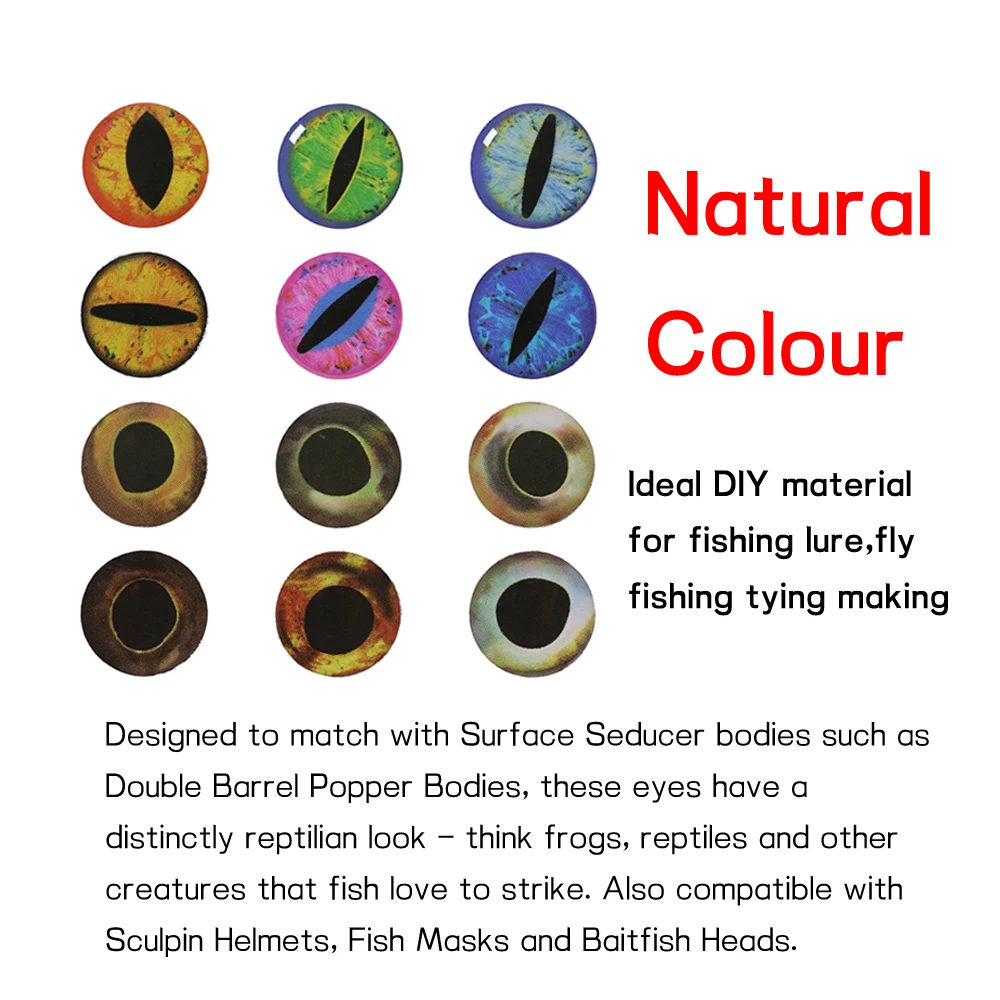 -Diseñados para combinar con cuerpos de Surface Seducer como los Double Barrel Popper Bodies, estos ojos tienen un aspecto claramente reptiliano: piense en ranas, reptiles y otras criaturas que a los peces les encanta atacar. También es compatible con cascos Sculpin, máscaras de pescado y cabezas de cebo.