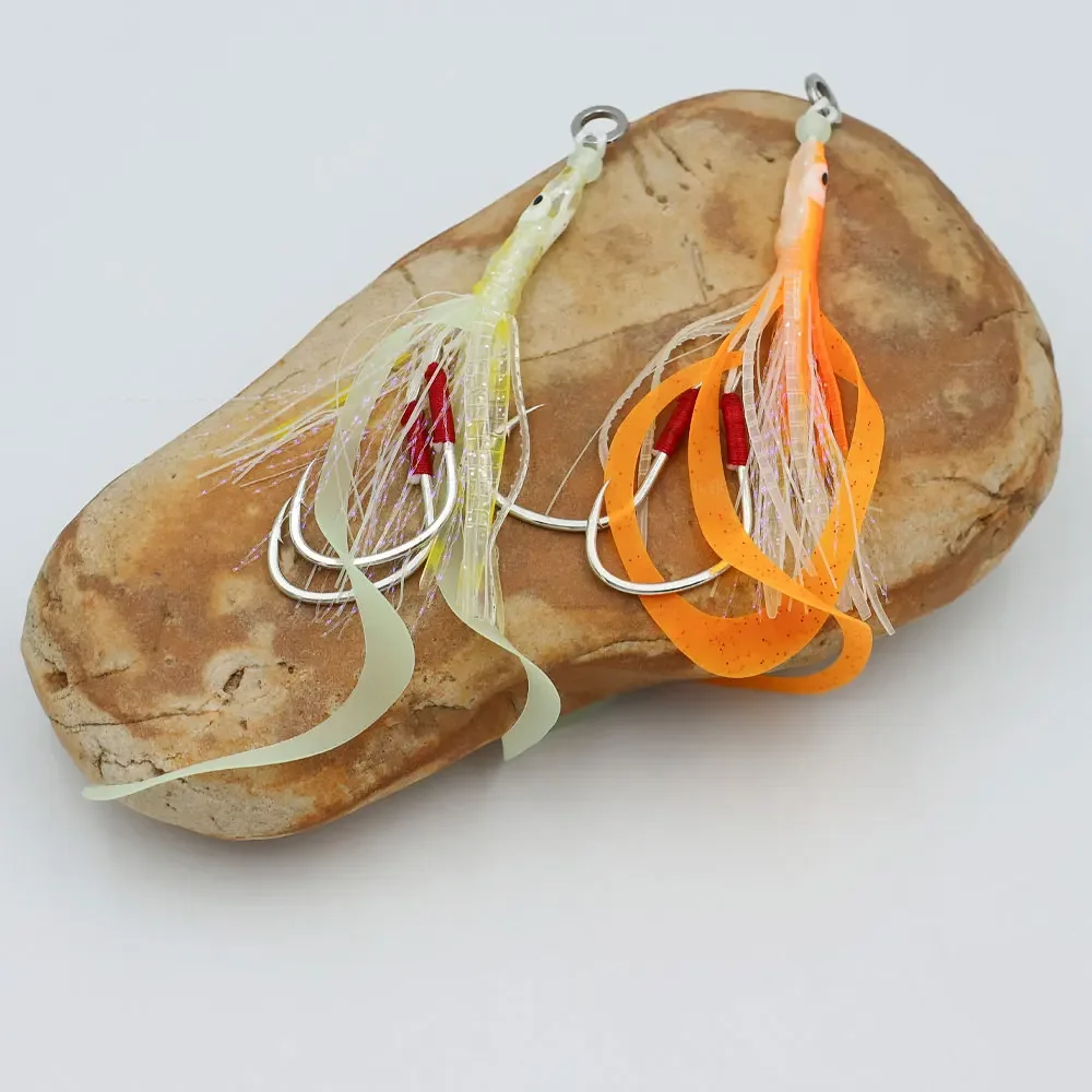 Bimoo 1/3 Uds 3/0 señuelo luminoso de falda de calamar suave con 2 anzuelos de asistencia de jigging lentos cebo de pesca con curricán de pulpo brillante señuelos de pesca de agua salada
