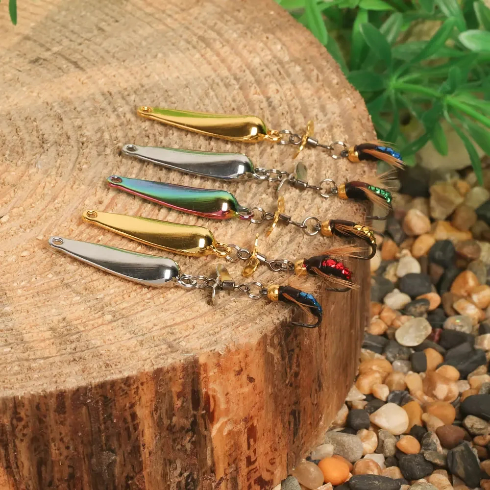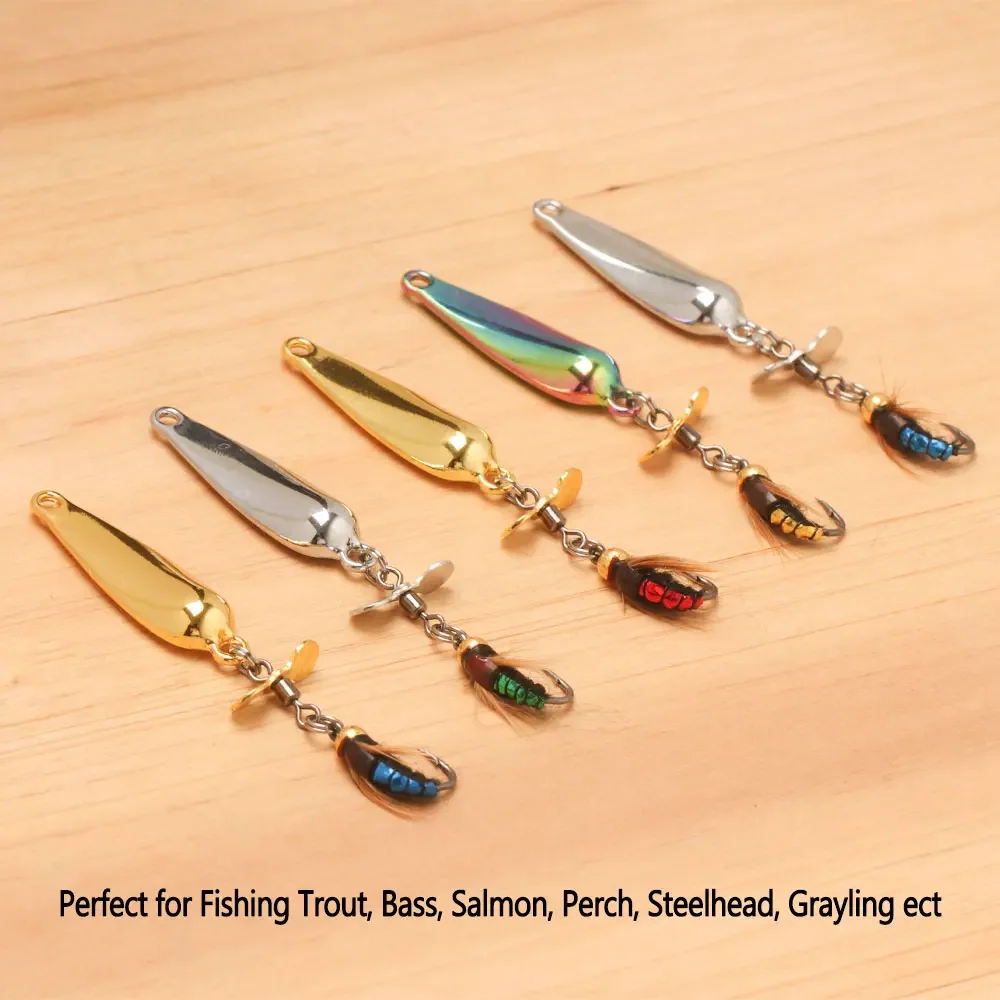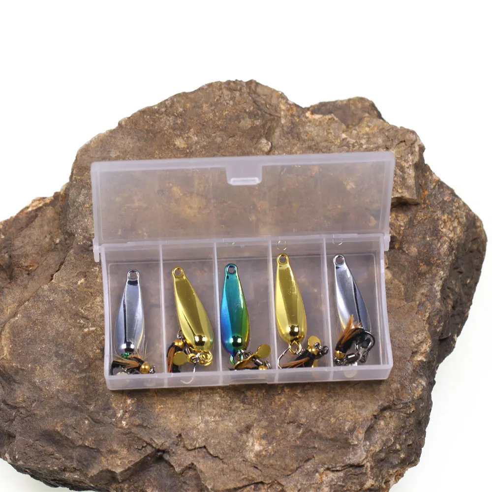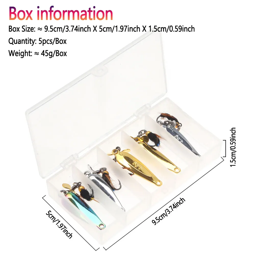 Bimoo 5 unids/caja Metal señuelo cuchara Spinner hélice lentejuelas insecto cebo insecto gusano moscas señuelo pesca conjunto trucha lubina Señuelos de Pesca