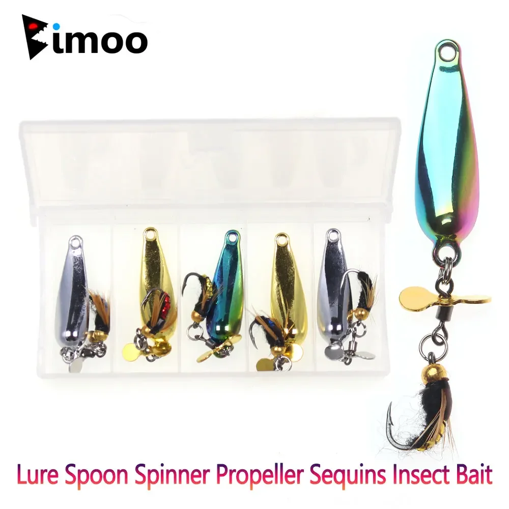 Bimoo 5 unids/caja Metal señuelo cuchara Spinner hélice lentejuelas insecto cebo insecto gusano moscas señuelo pesca conjunto trucha lubina Señuelos de Pesca