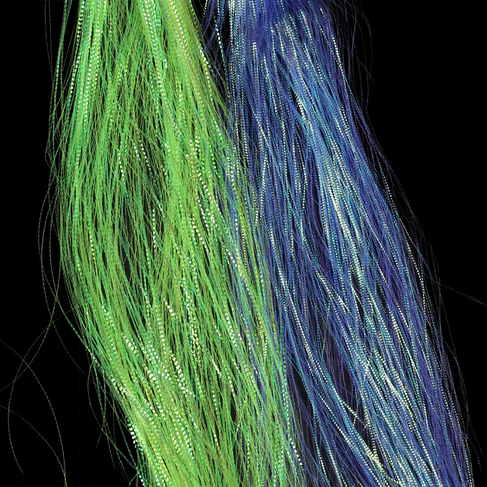 Características: las hebras de escamas laterales están corrugadas para que cuando refleje la luz, simule las escamas de un pez. Se utiliza para alas, colas, acanaladuras y material corporal. Es ideal para peces grandes de agua dulce y salada y patrones de cebo, así como jigs y poppers para pescar especies de aguas cálidas.