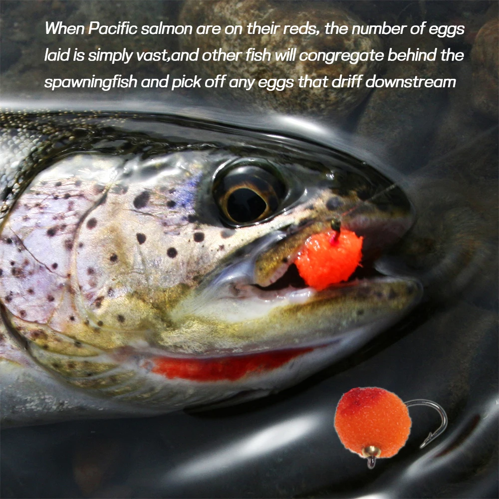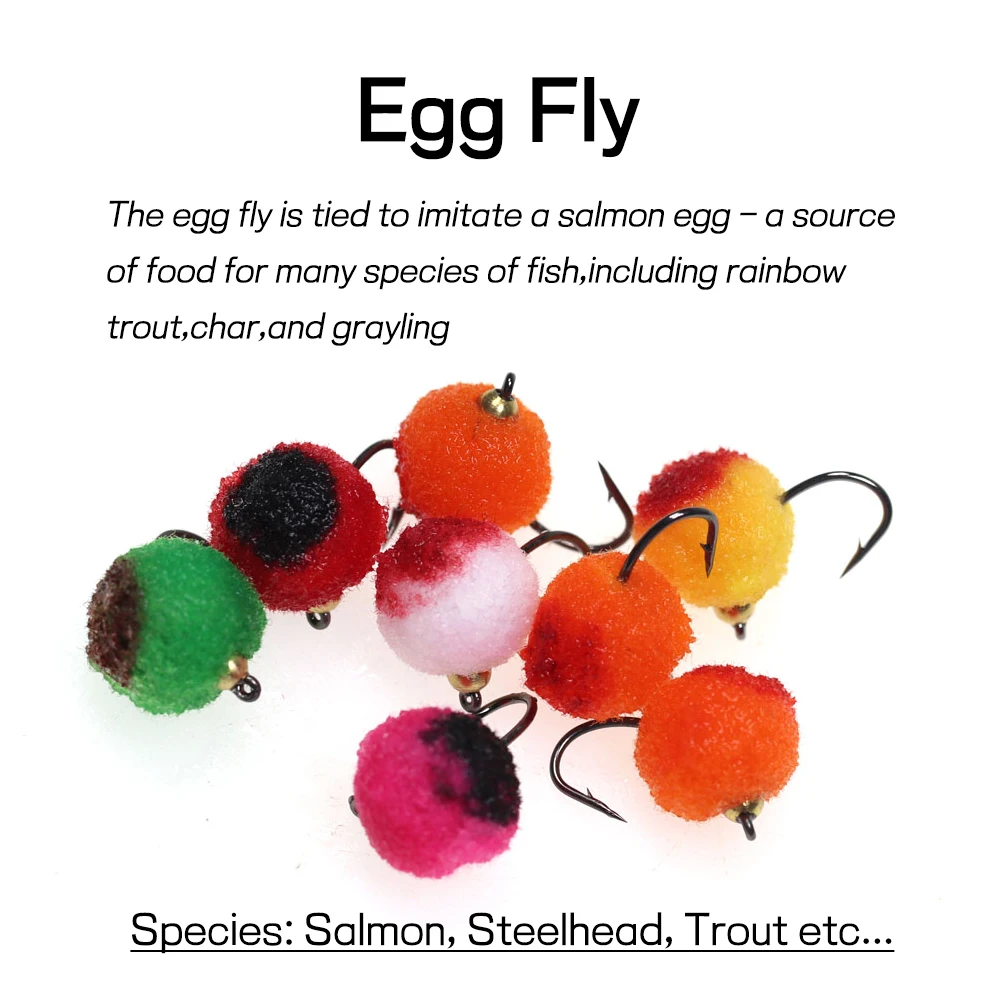 Una mosca de huevo, como los Estados del nombre, está atada especialmente para representar un huevo de salmón, una fuente de alimento para muchas especies de peces, incluyendo trucha arcoíris, char y gris, etc. Cuando el salmón del Pacífico se encuentra en sus rojos, La cantidad de huevos puestos es muy elevada, y otros peces se juntarán detrás del pez desove y recogerán cualquier huevo que gotee aguas abajo. Este patrón de moscas está atado con cabezales, para ayudar a bajarlo rápidamente para atrapar a los peces.