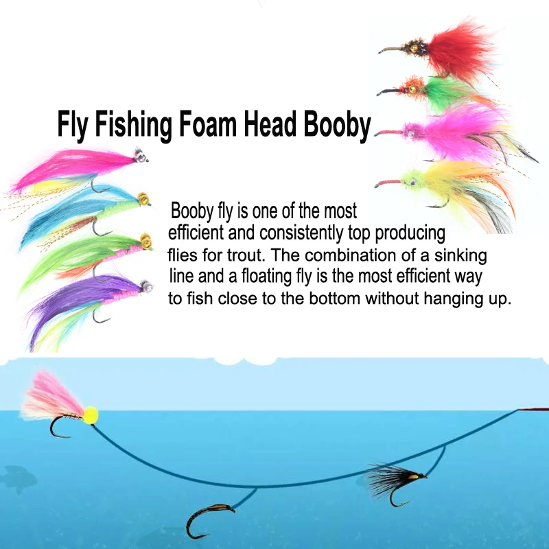 Booby Fly es una de las moscas más eficientes y consistentemente productoras de truchas. La combinación de una línea de hundimiento y una mosca flotante es la forma más eficiente de pescar cerca del fondo sin colgar.