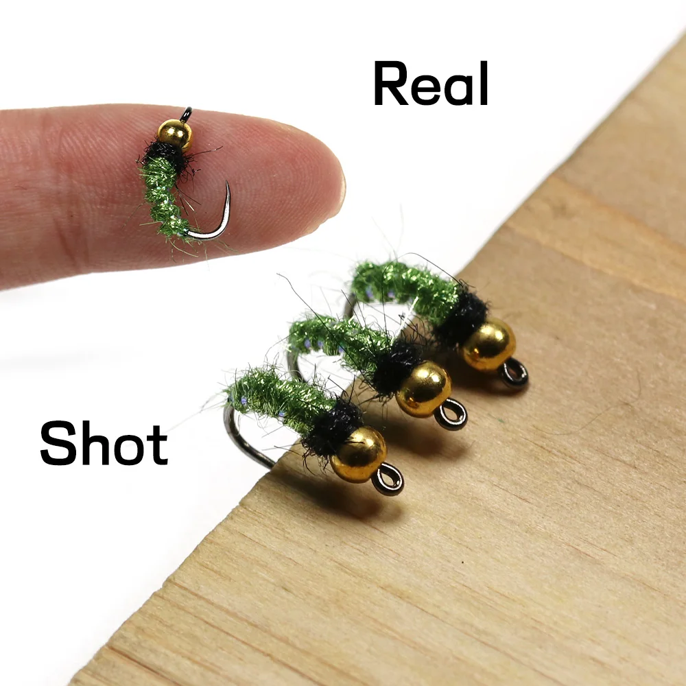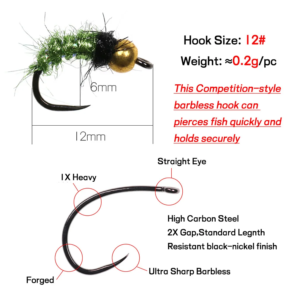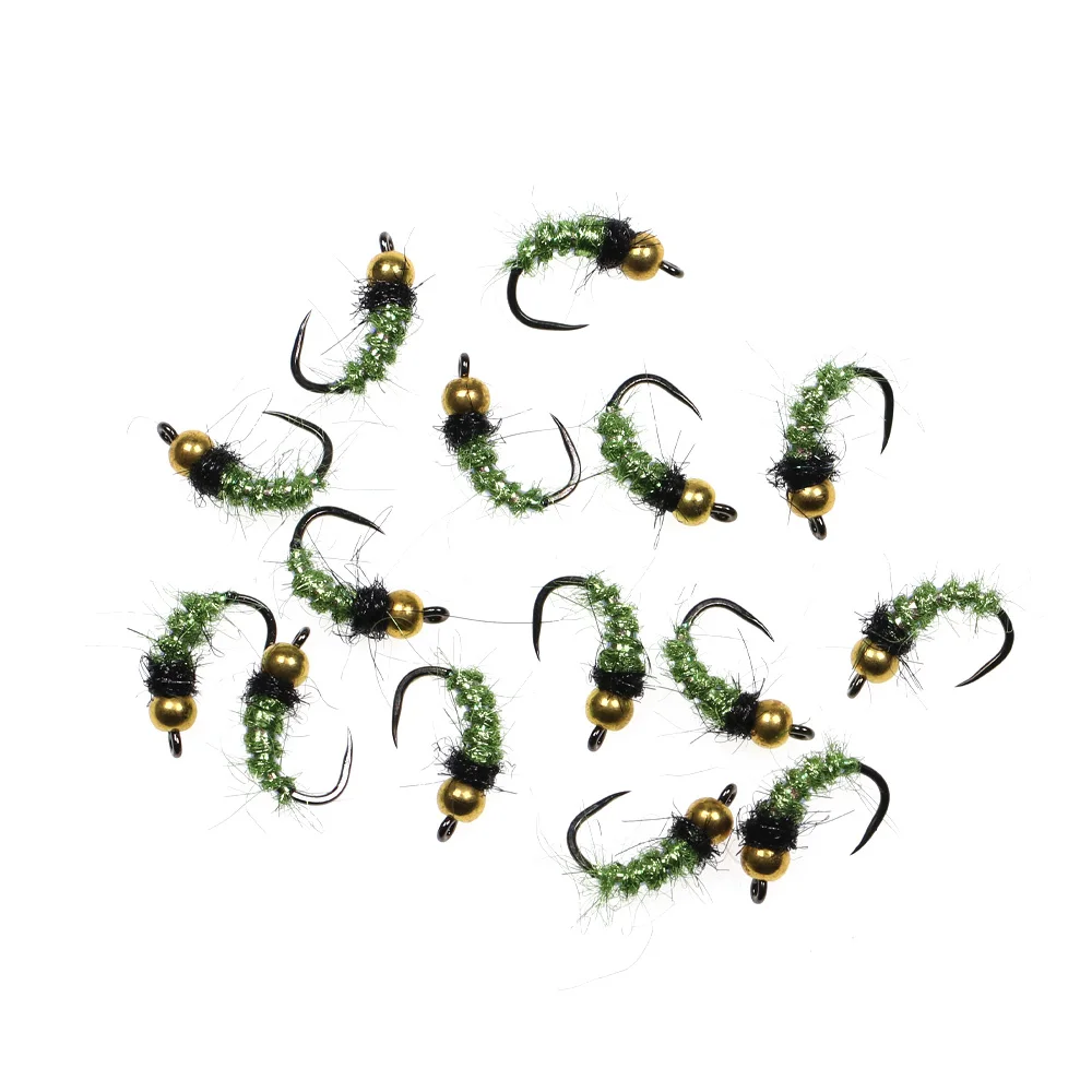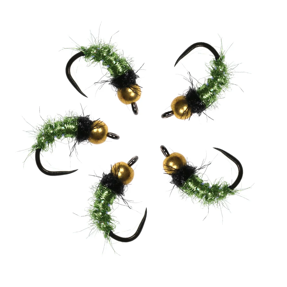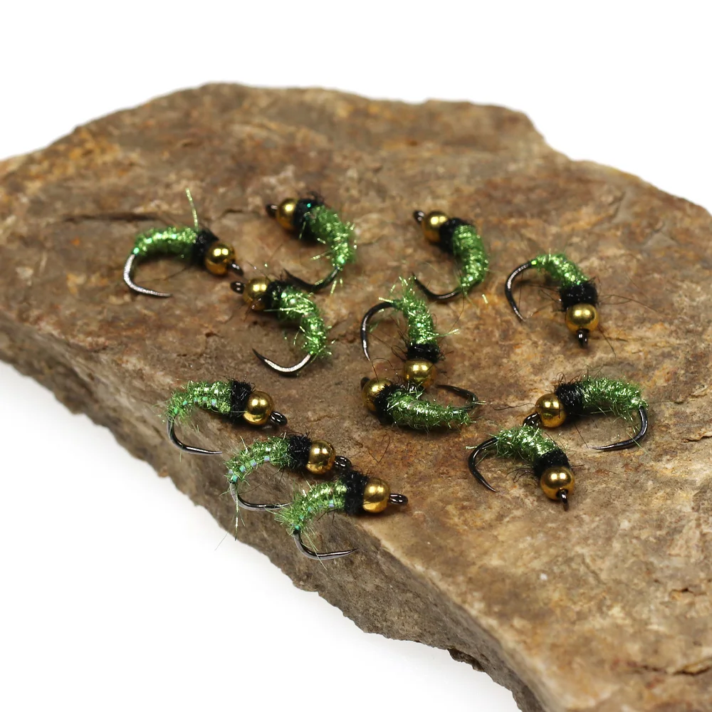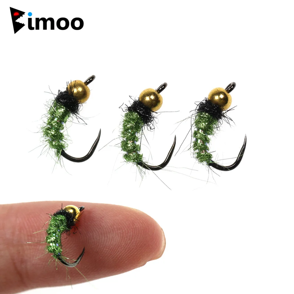 Bimoo #12 6 piezas cabeza de bola de latón Caddis Nymphs Mosca de hielo verde cuerpo de doblaje Flashabou Rib Barbless gancho de mosca trucha señuelo de pesca cebo